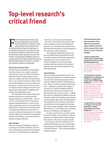 e valuator» in a clear, transparent manner. – My sense is that we have succeeded in this in the evaluation of the Top-level Research Initiative, states Mr Wied, who found the dialogue between the parties in the programme to be constructive, open and honest. The challenges identified along the way have provided a basis for productive discussion and assessment within the organisation regarding issues such as industry involvement, the balance between innovation activities and basic research, the number of thematic areas and the prioritisation of funding among them. Great ambitions The four evaluation reports present the Toplevel Research Initiative as a well-functioning research and innovation programme with a relevant, balanced portfolio of promising projects. There are, however, many thematic priorities – perhaps too many for the initiative’s own good, according to DAMVAD. With its extensive size and scope, the initiative has great ambitions in a variety of areas. – I think the real-time evaluation has influenced the development of the Top-level Research Initiative, asserts Mr Wied. Most of the funding had been allocated before the evaluation commenced, so the influence in this regard has been limited to the strategic funding reserve, which was allocated in 2013. According to the consultant, however, this influence was significant. In order to get the most out of the remainder of the funding, it was decided to build on positions of strength already achieved under the initiative, with a focus on green growth. – In my opinion, the Top-level Research Initiative has invested in an array of promising, relevant projects headed by talented people, concludes Mr Wied. – This is the programme’s greatest strength.