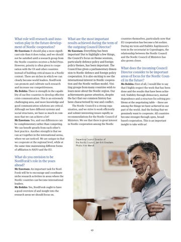 What do you envision to be NordForsk’s role in the years ahead? Mr Enestam: An important task for NordForsk will be to encourage and coordinate niche research activities in areas where the Nordic countries can become international leaders. Ms Bohlin: Yes, NordForsk ought to have a good overview of and insight into the research areas we should focus on.
