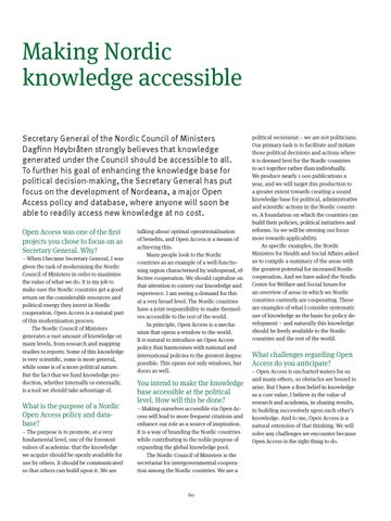 political secretariat – we are not politicians. Our primary task is to facilitate and initiate those political decisions and actions where it is deemed best for the Nordic countries to act together rather than individually. We produce nearly 1 000 publications a year, and we will target this production to a greater extent towards creating a sound knowledge base for political, administrative and scientific actions in the Nordic countries. A foundation on which the countries can build their policies, political initiatives and reforms. So we will be steering our focus more towards applicability. As specific examples, the Nordic Ministers for Health and Social Affairs asked us to compile a summary of the areas with the greatest potential for increased Nordic cooperation. And we have asked the Nordic Centre for Welfare and Social Issues for an overview of areas in which we Nordic countries currently are cooperating. These are examples of what I consider systematic use of knowledge as the basis for policy development – and naturally this knowledge should be freely available to the Nordic countries and the rest of the world.