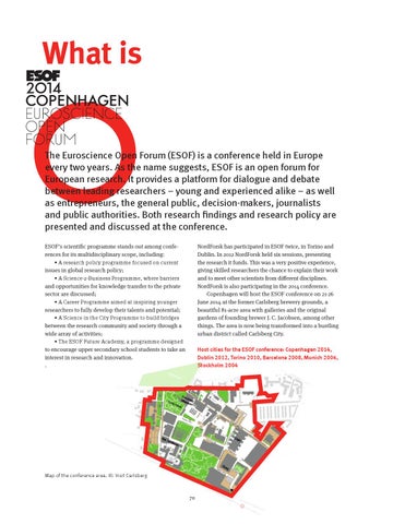 The Euroscience Open Forum (ESOF) is a conference held in Europe every two years. As the name suggests, ESOF is an open forum for European research. It provides a platform for dialogue and debate between leading researchers – young and experienced alike – as well as entrepreneurs, the general public, decision-makers, journalists and public authorities. Both research findings and research policy are presented and discussed at the conference. ESOF’s scientific programme stands out among conferences for its multidisciplinary scope, including: • A research policy programme focused on current issues in global research policy; • A Science-2-Business Programme, where barriers and opportunities for knowledge transfer to the private sector are discussed; • A Career Programme aimed at inspiring younger researchers to fully develop their talents and potential; • A Science in the City Programme to build bridges between the research community and society through a wide array of activities; • The ESOF Future Academy, a programme designed to encourage upper secondary school students to take an interest in research and innovation. .