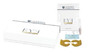 Janssen Cosmetics Eyeceuticals Treatment kit er en klinikkbehandling for øyepartiet. Kundene kan legge til daglige behandlinger for et synlig og merkbart jevnere øyeområde. Kitet byr på 10 Eye Flash Fluid Ampoules, 10 Limited Golden Lift Eye Masks, og 1 x 15 ml Blue Fresh Eye Care.