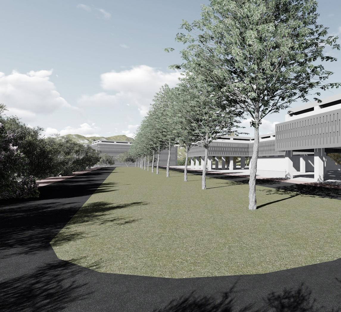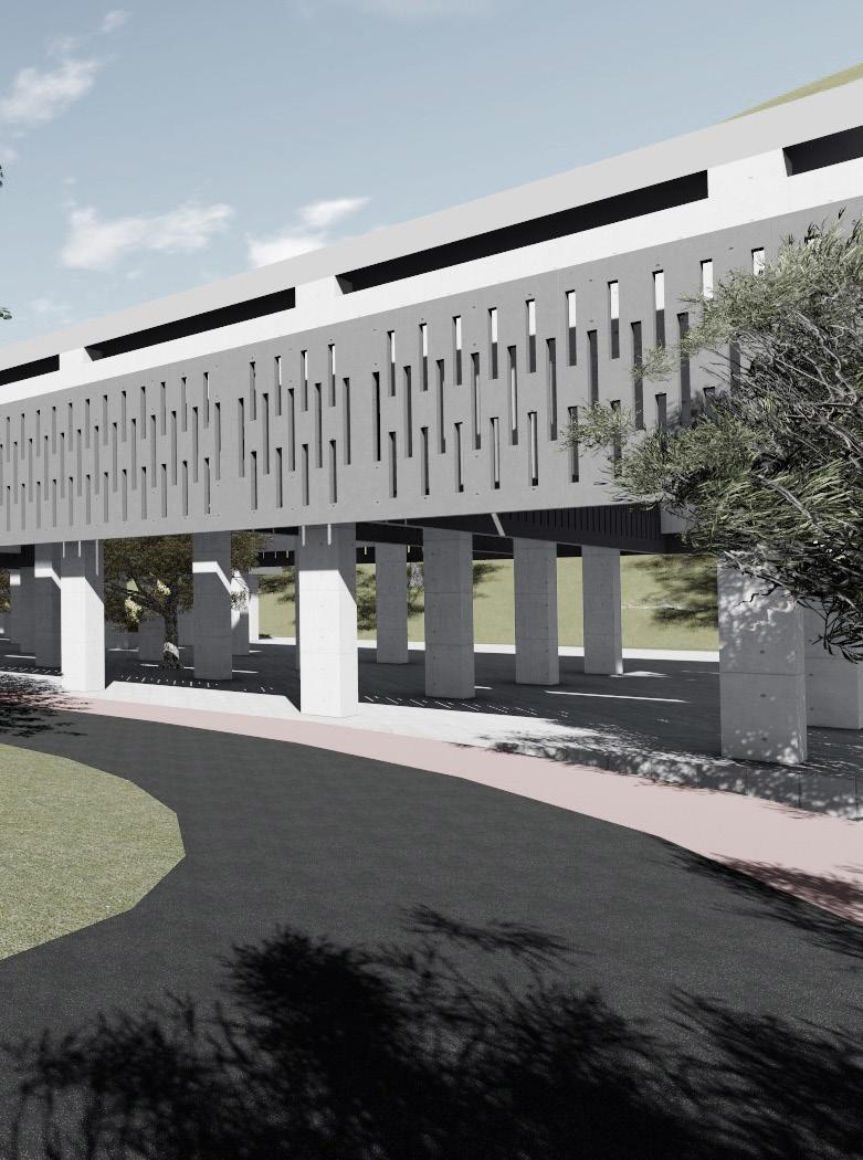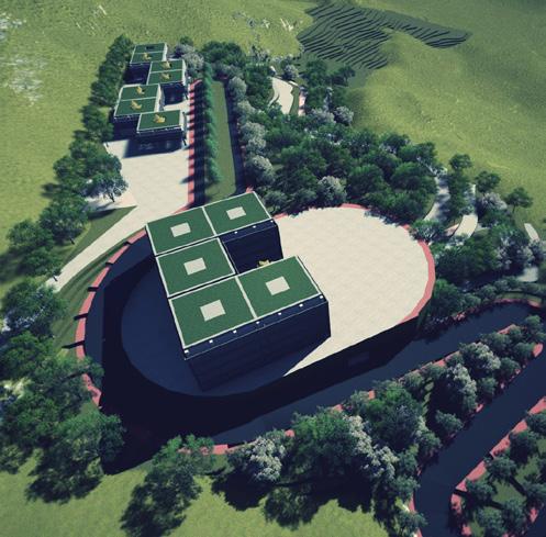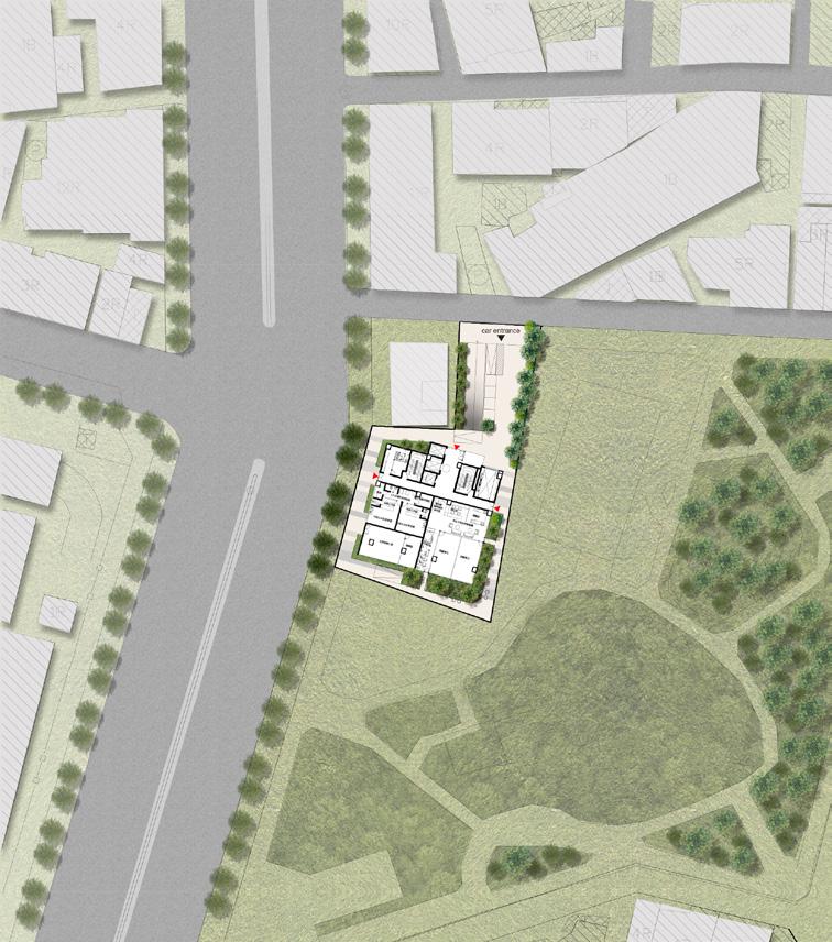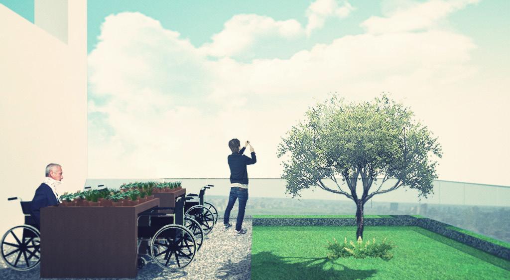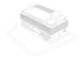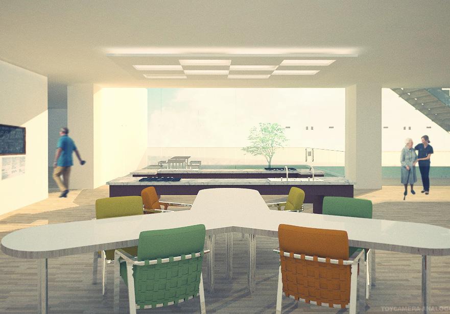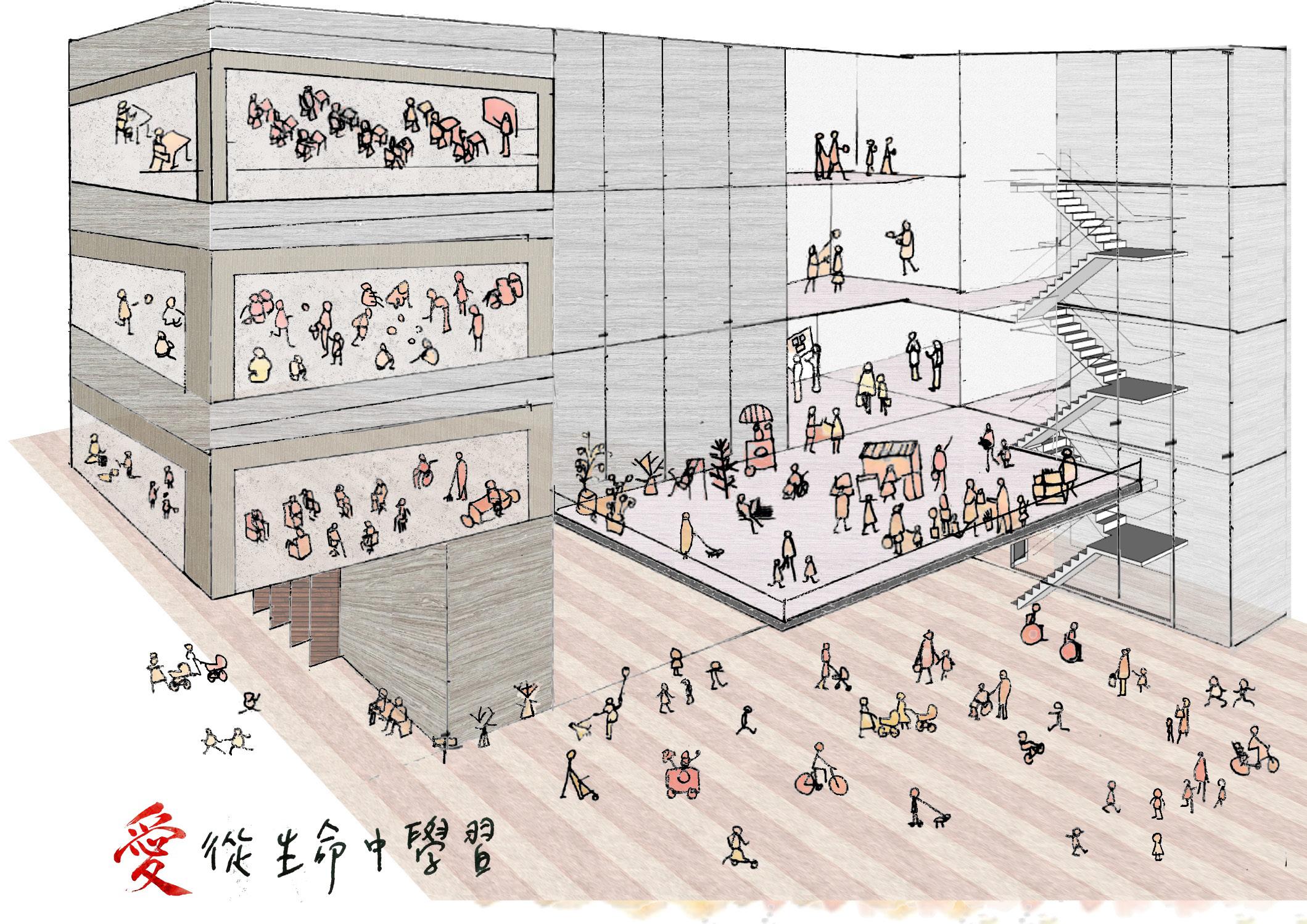 將原本封閉的、內向的照顧機能打開,適度介入公共的、社會參與的開放空間,由地面層延伸向上,由 外而內的引入此公共空間,與身心障礙、年長者照護空間相結合,不僅對外彰顯生命教育的本質,對內 可藉由社會活動地參與,提升受照顧者的生命價值,故於全盤考量後,將原本封閉內向的中庭打開,利 用錯動的配置型態,巧妙連結基地東側的水磨坑溪,引進來自關渡平原的稻田地景,西側則配置療育機 能的後花園,與稻香公園相連接,創造富有南向陽光,各種年齡層彼此互動交融的露台、陽台創造稻香 市場的新氣象。