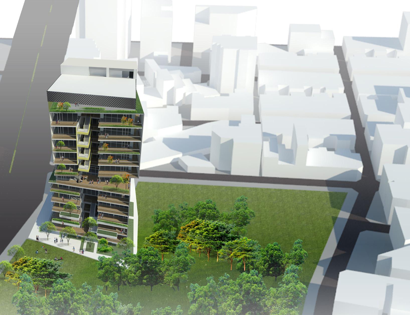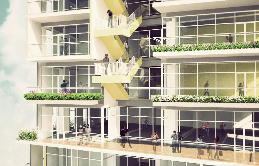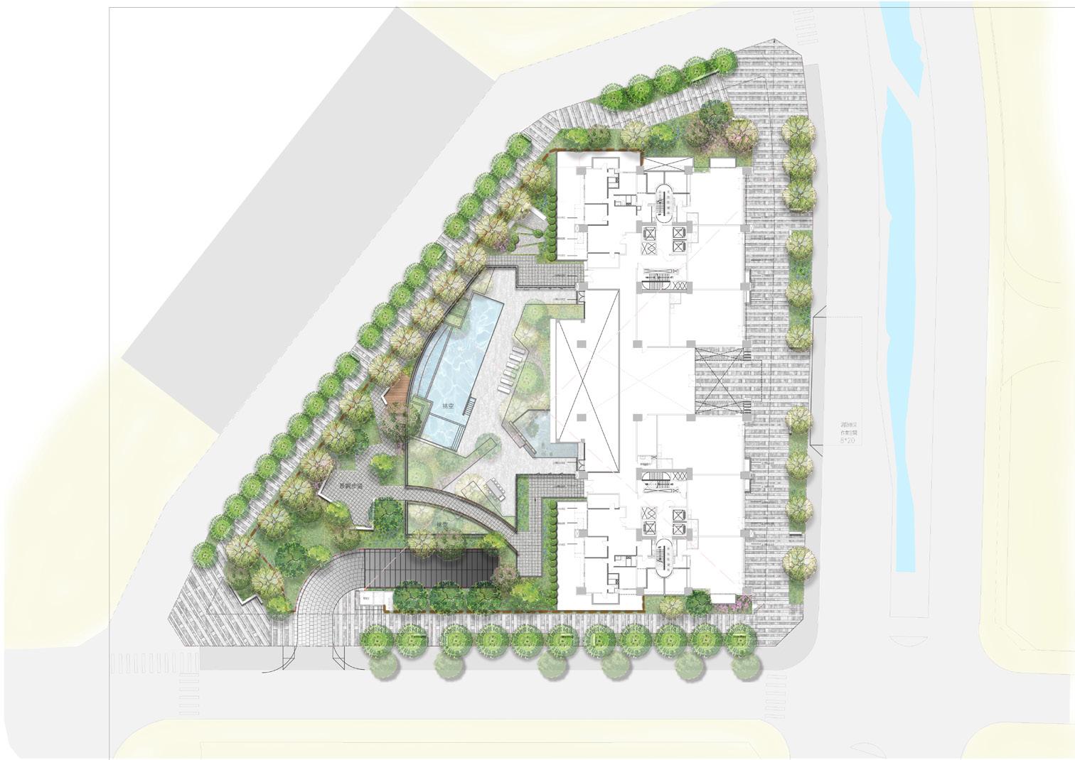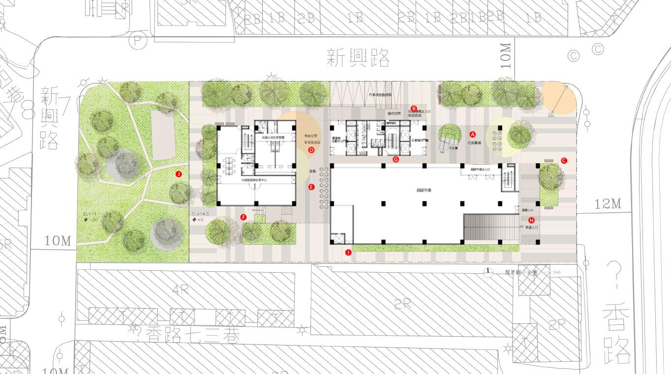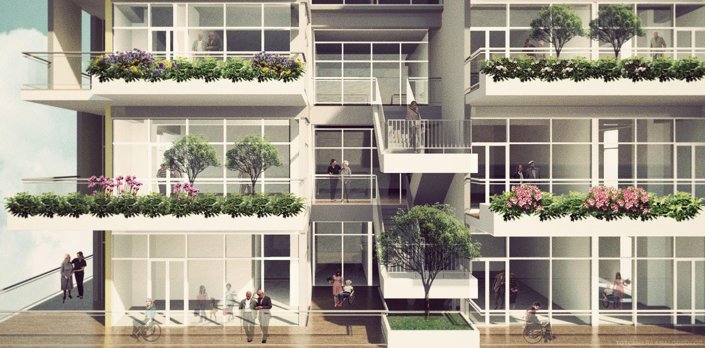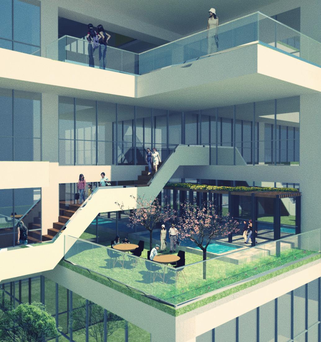 創造半戶外公共挑空空間, 將社會參與空間內化,強調 社區友善關懷 透過上下樓層的互動,創造 不同層次的開放空間,注入 生命中活力到本案中。