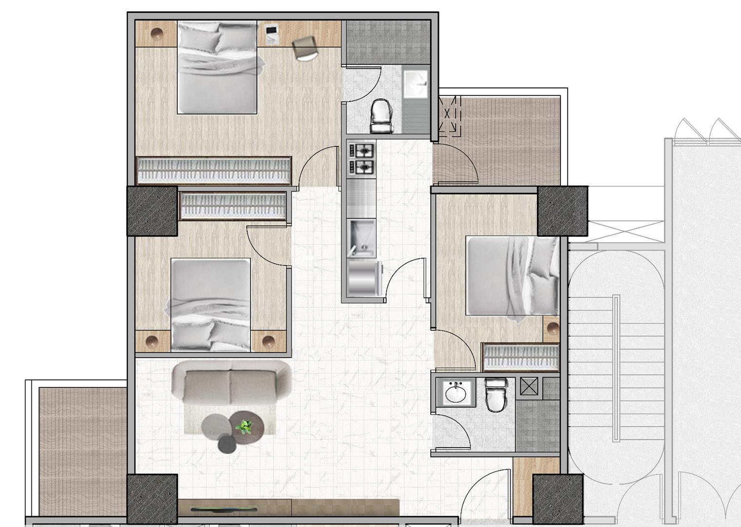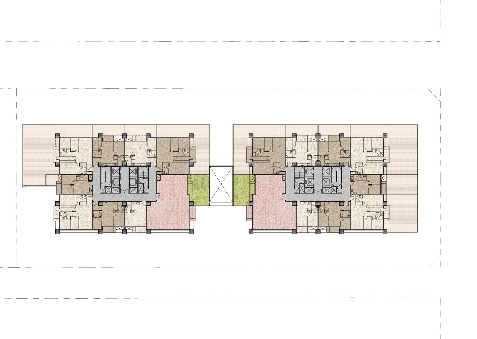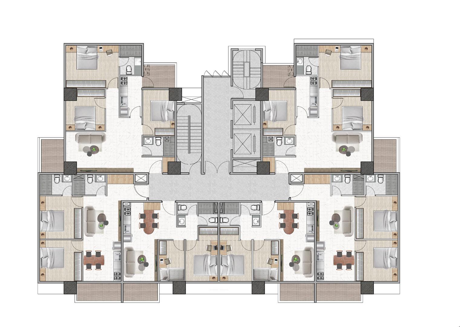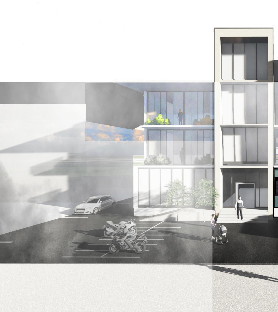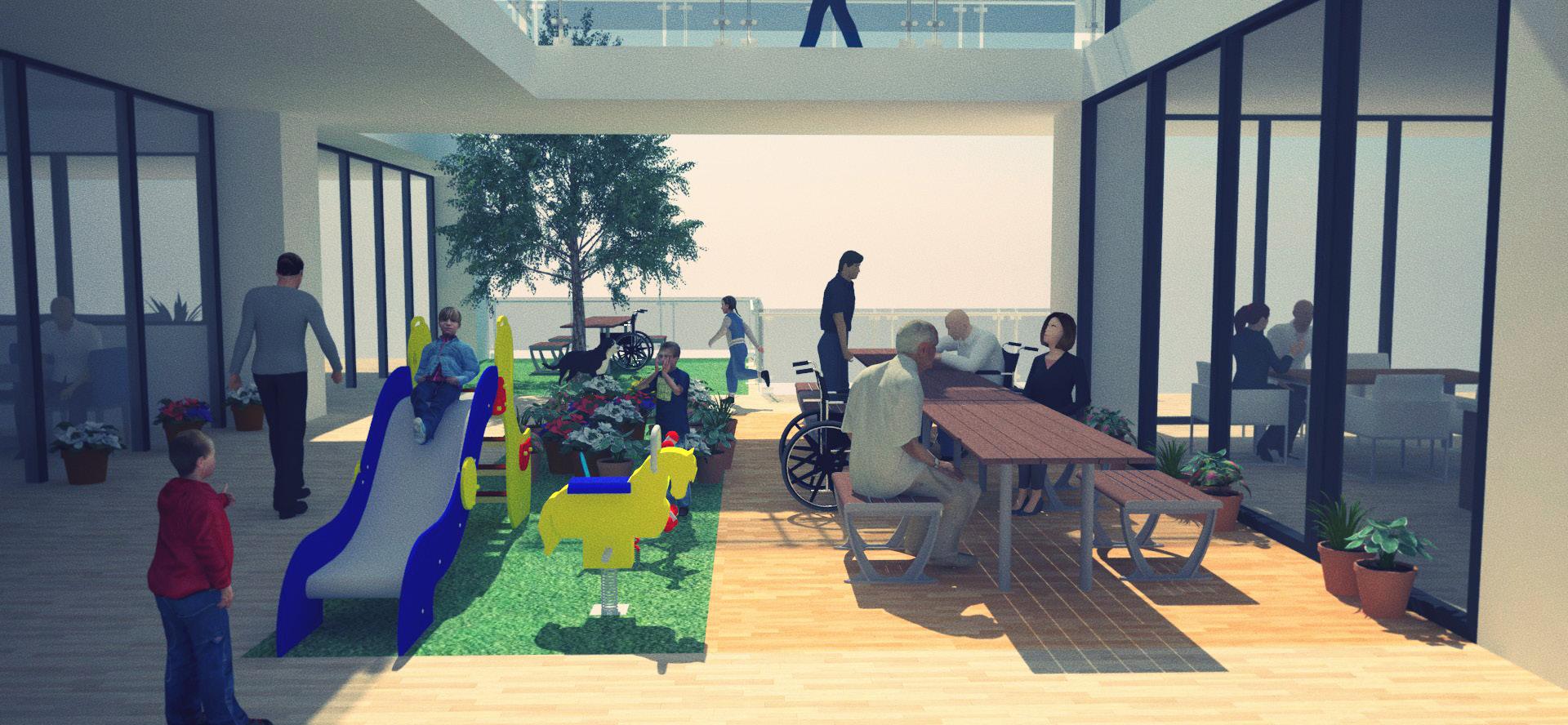 創造半戶外公共挑空空間, 將社會參與空間內化,強調 社區友善關懷 透過上下樓層的互動,創造 不同層次的開放空間,注入 生命中活力到本案中。