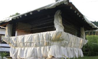 나무 기둥에 걸려져 있는 한지들이 바람을 맞아 내는 바스락 소리