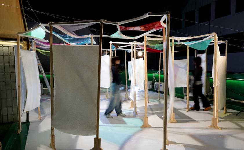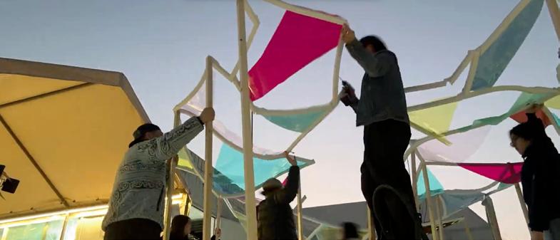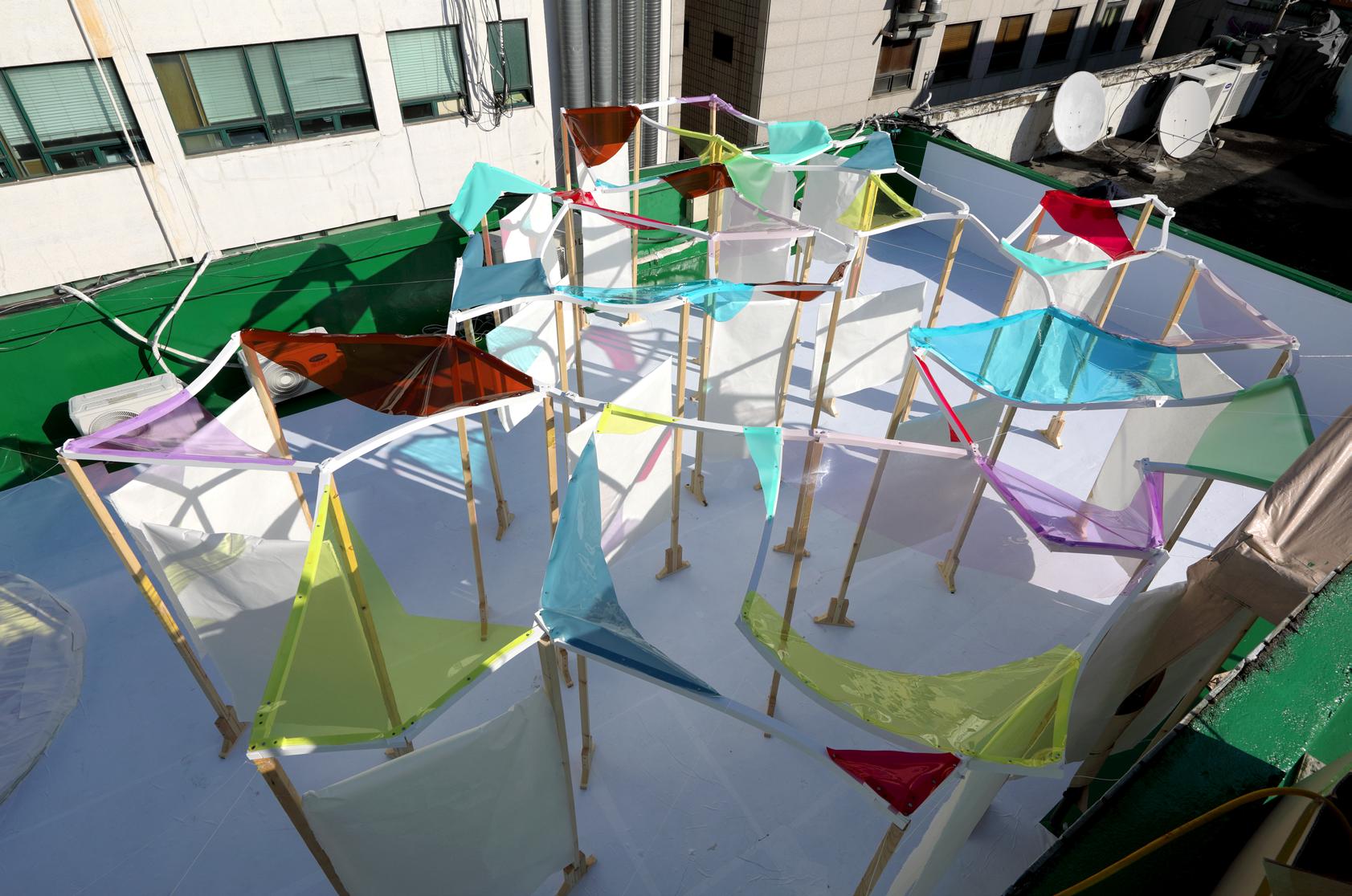 <Mosaic of Resilience> presents a harmonious society formed by colorful fragments elevated on wooden pillars. The structure is shaped after the map of Seoul, allowing viewers to see the city illuminated as a whole when looking at the work from above. The variously colored PVC pieces, symbolizing Seoul, visualize the diverse forms of resilience that individuals carry.