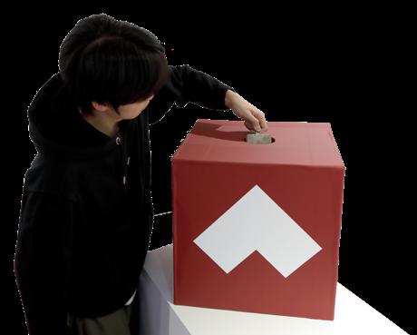 〈Still the little you! 〉 begins with this question and explores the essence of self that persists through change. The imperfect red sphere at the center represents a “core of existence” that is perceived differently by each viewer. The surrounding metal rings signify external influences, while the reflective box below reveals how the self shifts depending on one’s viewpoint.