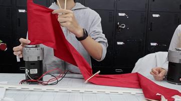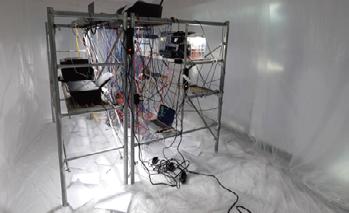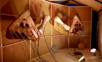 different beings attempt to recognize one another. A fabric body responds softly to wind and a motor, evoking an organism that imagines itself alive. Visitors bend under low wires at the entrance, revealing instinctive caution and misunderstanding. A tower wired back to the body looks down— not threatening but acknowledging.