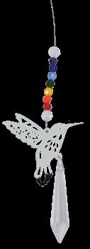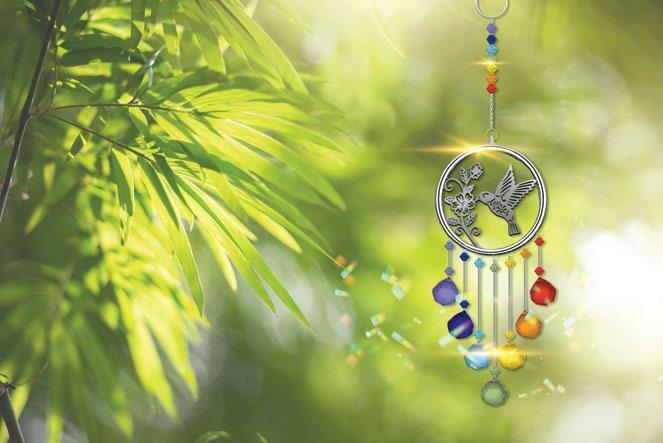This natural crystal suncatcher captures the rainbow hues and radiates colorful light from the drop pendant.