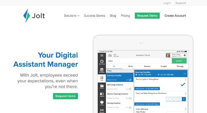 Jolt adalah sebuah platform yang terintegrasi cloud untuk mengumpulkan data, menampilkan informasi, dan memantau segala hal dalam sebuah bisnis. Startup asal Utah, US ini menghadirkan 3 solusi utama pada produk task manager, yaitu Team Accountability, Digital Food Safety, dan Employee Performance