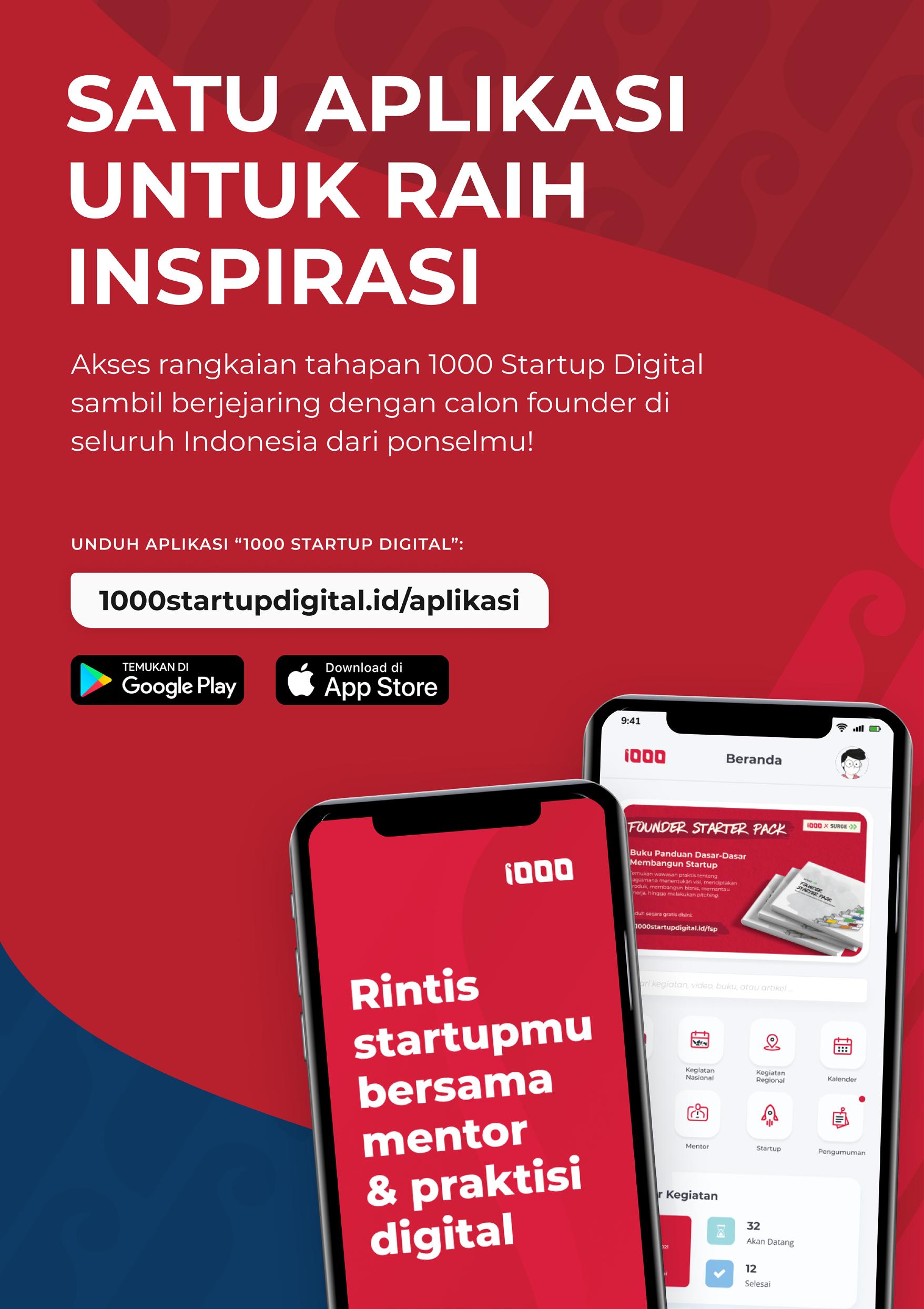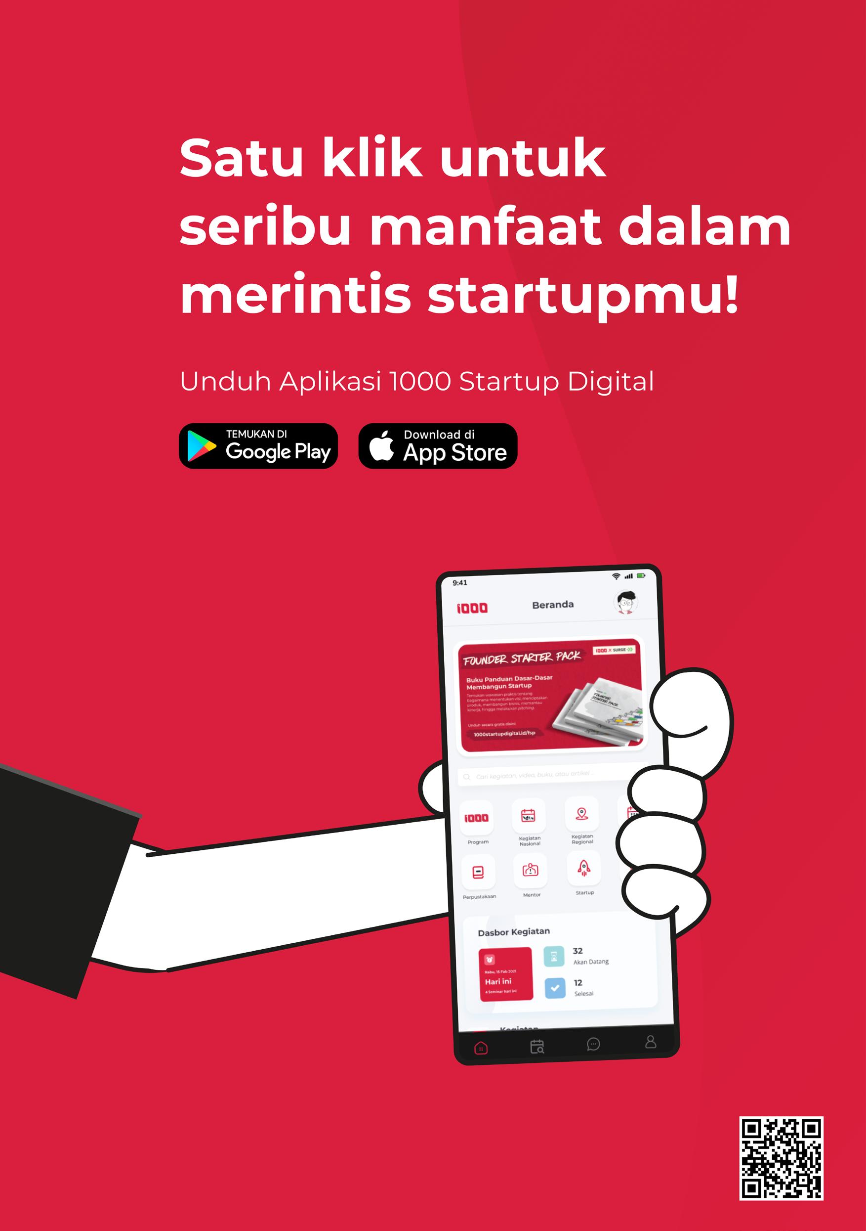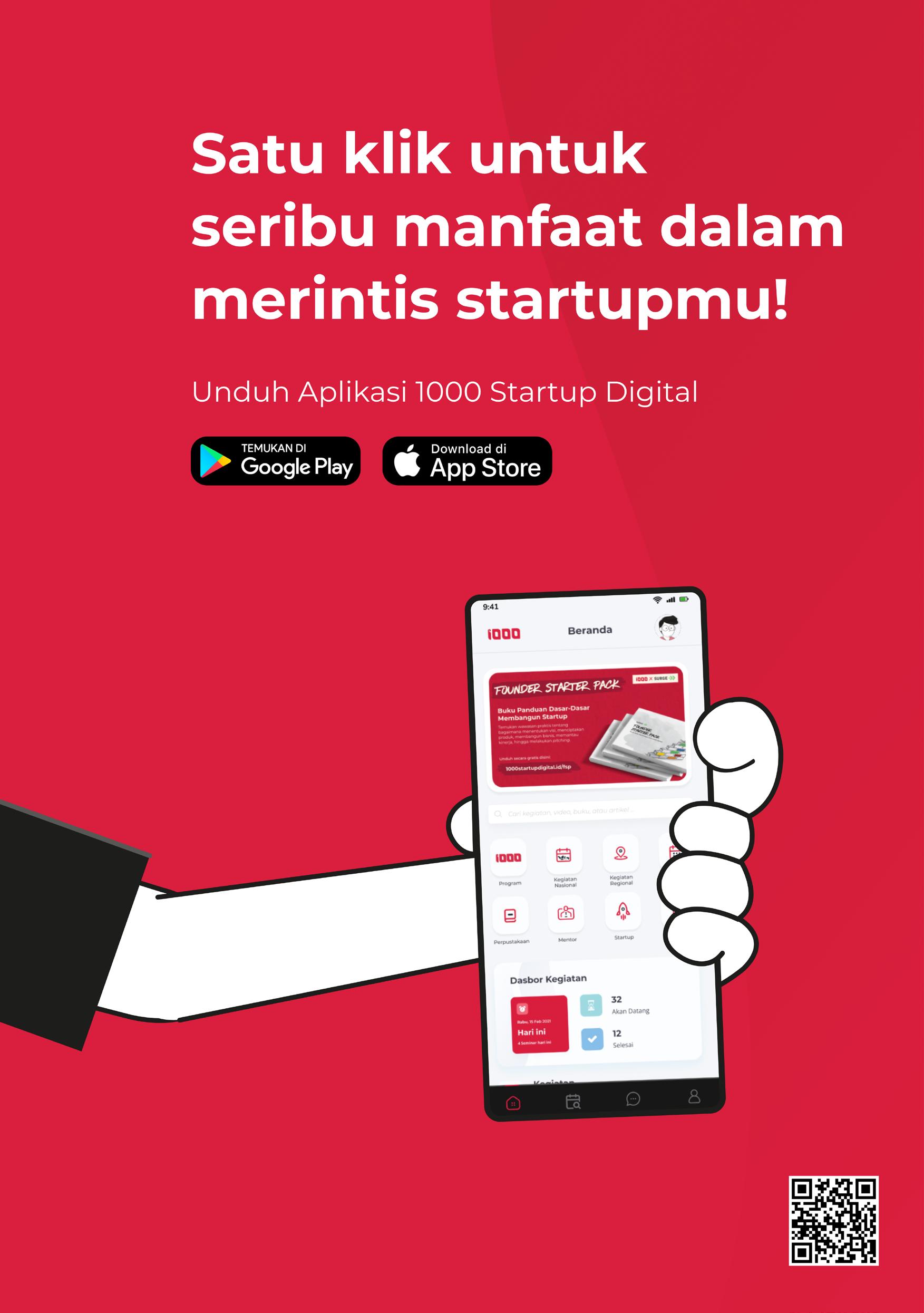 Nasional 1000 Startup Digital yang dapat diikuti dari manapun melalui aplikasi di gawai. Bagi mereka yang startupnya sudah memiliki produk dalam tahap purwarupa atau MVP dan sedang menuju productmarket fit, mereka bisa ikut program Startup Studio Indonesia. Lalu, bagi para pelaku startup yang masih
