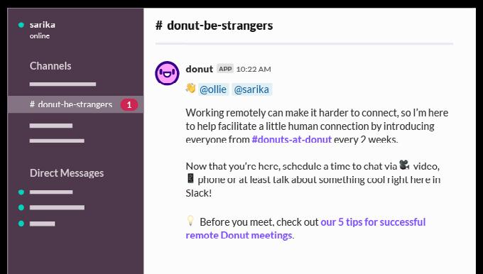 Donut adalah tools yang membantumu untuk bisa mengenal lebih dalam anggota tim lewat pertanyaan variatif yang dikirimkan sewaktu-waktu di sela bekerja. Startup asal New York ini bisa diintegrasikan pada Slack, sehingga nantinya dalam waktu-waktu tertentu secara otomatis akan muncul pertanyaan yang memantik anggota tim kamu berbagi pengalaman dan ketertarikannya. Tidak secara acak, pertanyaan-pertanyaan tersebut disesuaikan oleh template yang dipilih sesuai kebutuhan. Hingga saat ini Donut memiliki 45 template pertanyaan, mulai dari seputar New Hires, Remote Work, Social, New Hires, hingga Watercooler atau pertanyaan untuk ice breaking