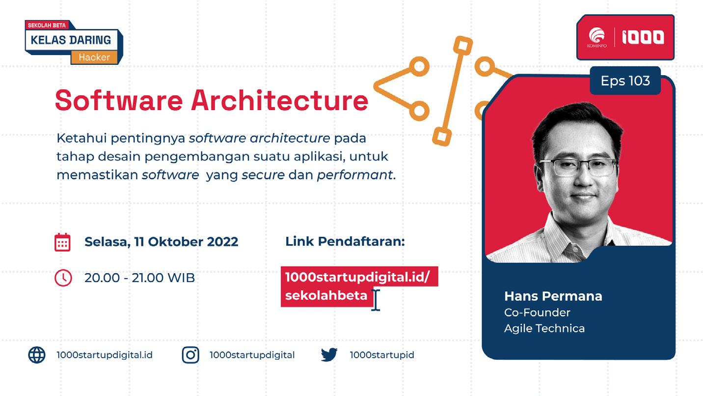 Pada episode Sekolah Beta kali ini membahas Software Architecture , Hans Permana selaku Co-Founder Agile Technica . Sebelum memutuskan untuk kembali ke Indonesia, beliau pernah berkarir di berbagai negara sebagai Software Developer di Brockmann Consult GmbH, Software Engineer di HealthLink, juga Research Assistant di RMIT University.