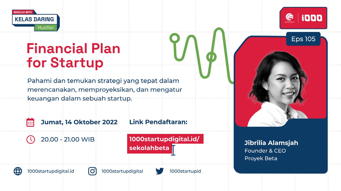 Pada materi Sekolah Beta kali ini menghadirkan Jibrilia Alamsjah , ia merupakan Founder & CEO Proyek Beta yang membagikan ilmunya terkait dasar keuangan startup, game plan keuangan dan cara membuat proyeksi keuangan untuk startup. Sebelumnya, Jibrilia pernah berkarir di dunia perbankan, Chief Financial Officer (CFO) di 3-entity Holding Company, Head of Finance di Bukukas.
