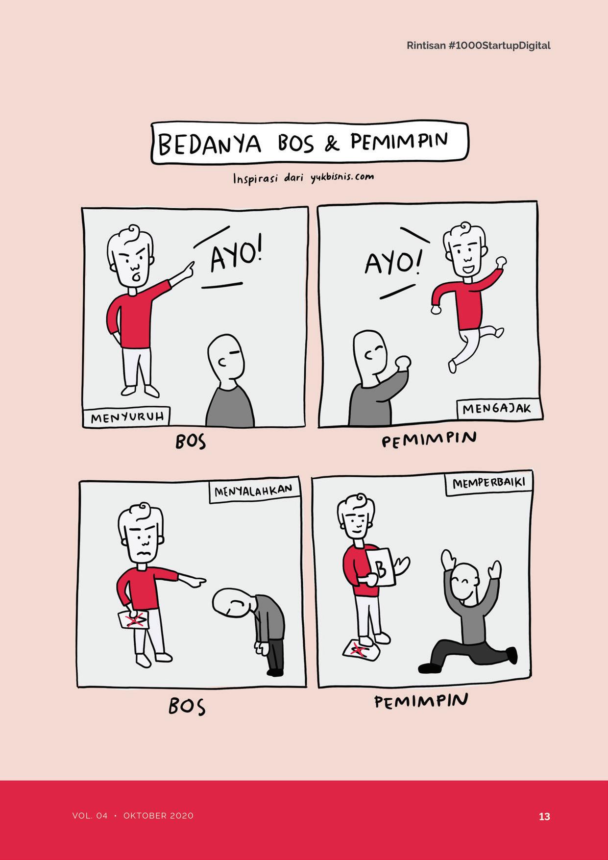 Rintisan #1000StartupDigital 7 VOL. 04 • OKTOBER 2020 Buku, Film, & Podcast Telah dikurasi, tinggal diresapi, dinikmati, dan dibagi pada teman-teman lainnya! Rekomendasi 20 Gak Perlu Berkelit, Begini Cara Menghadapi Obrolan yang Sulit Kemampuan berkomunikasi yang baik adalah satu hal terpenting untuk seorang founder kuasai. In-Depth 24 3 Cara Pemimpin Hebat Peduli pada Timnya Bagaimana Etika Saat Memberi Feedback? Apa saja indikatornya dan apakah kamu sudah melakukannya? Niat yang baik untuk bikin perubahan harus disampaikan dengan cara yang baik juga. In-Depth In-Depth 46 40