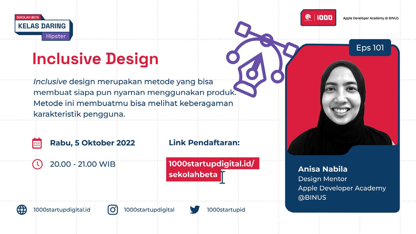 Pada episode Sekolah Beta serial Hipster kali ini dibawakan, Anisa Nabila yang merupakan Design Mentor di Apple Developer Academy @BINUS. Topik kali ini, Anisa akan membahas seputar metode mengembangkan sebuah produk yang dapat digunakan oleh keberagaman pengguna atau Inclusive Design .