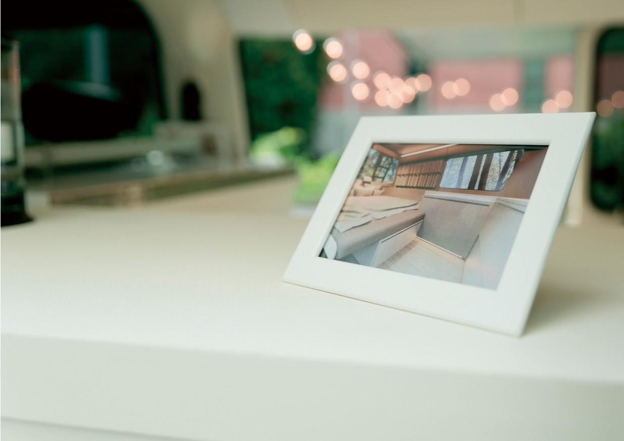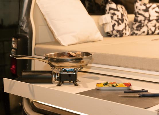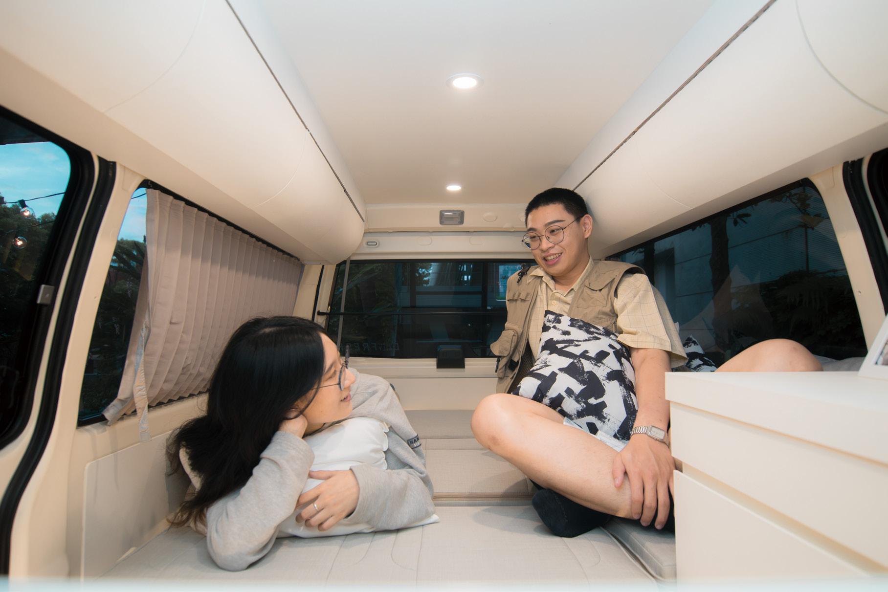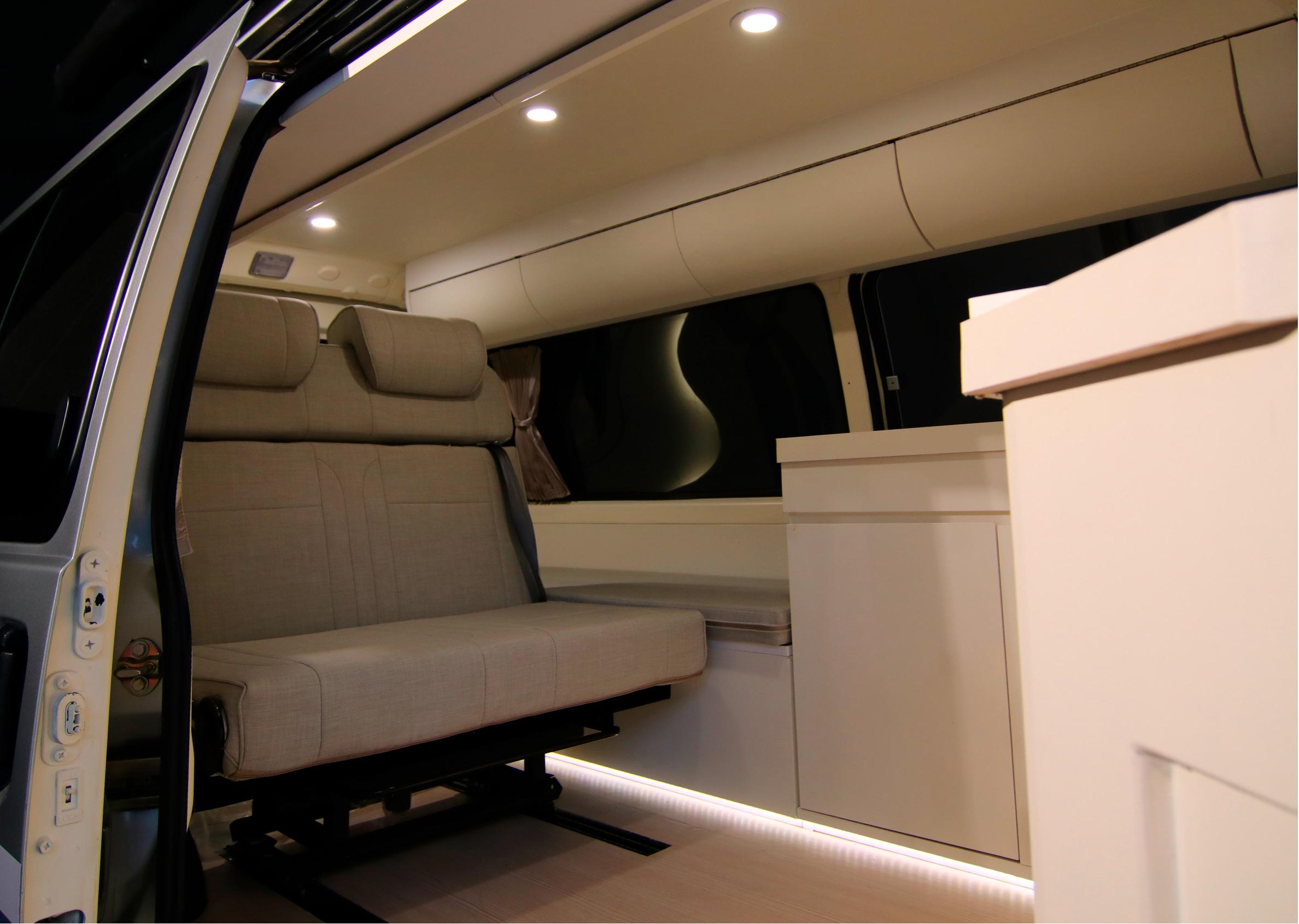 為了讓乘客能舒服地躺在車裡,車內家 具的上方都是軟墊材質配合滑軌椅的 變化,讓車裡整體空間形成一張大床, 讓乘客可以舒適的躺在車裡休息。