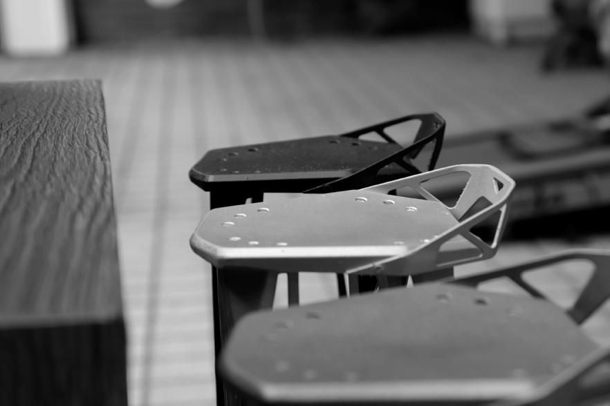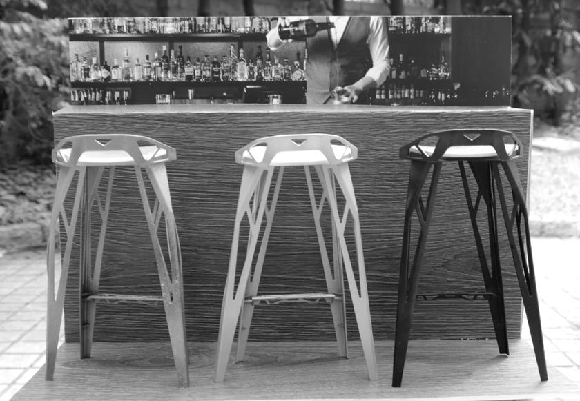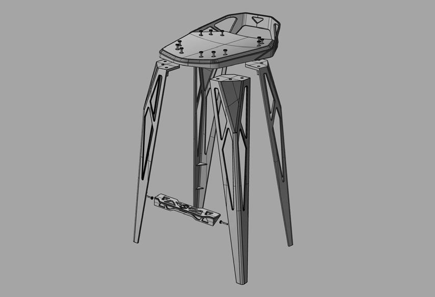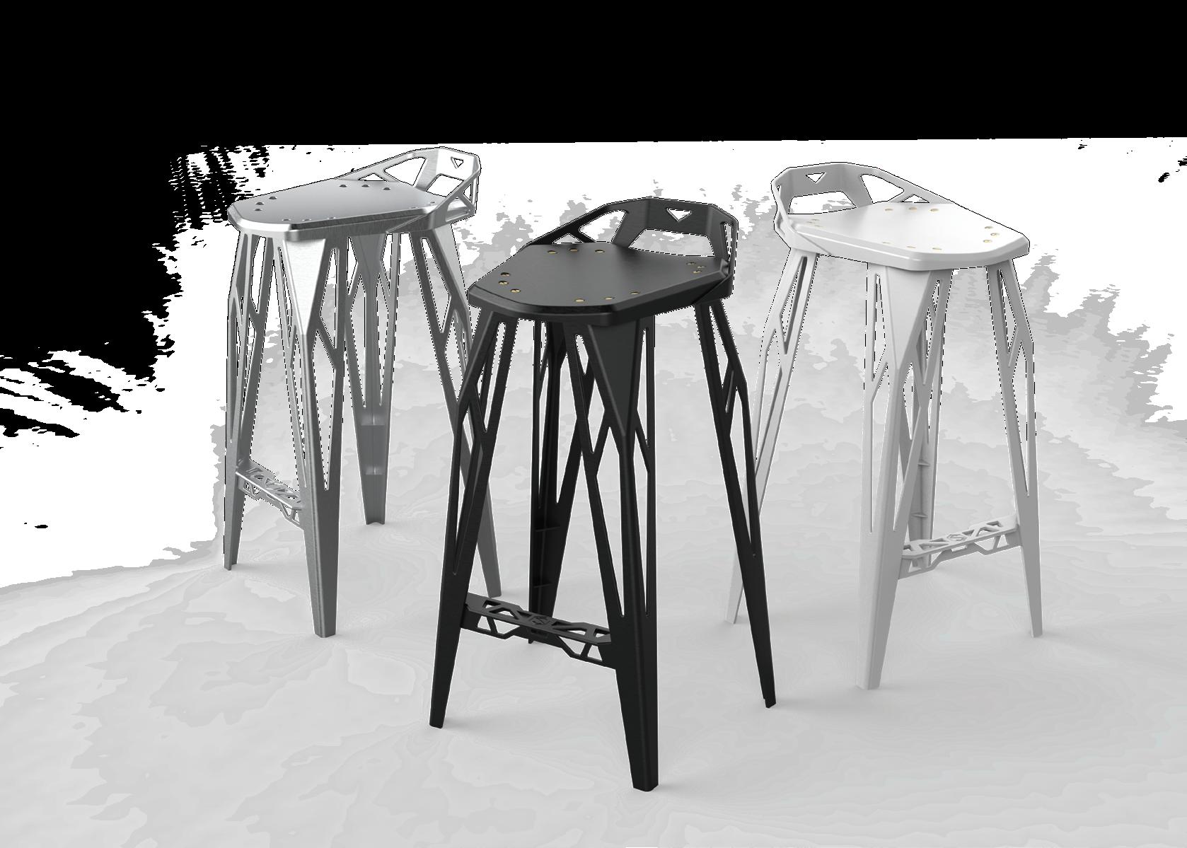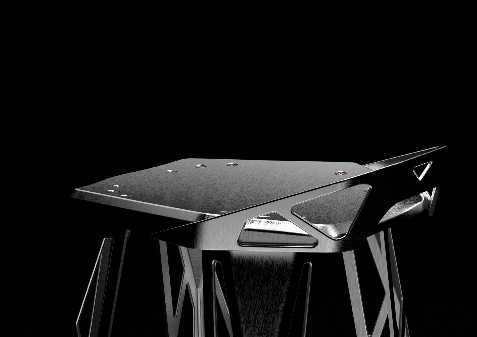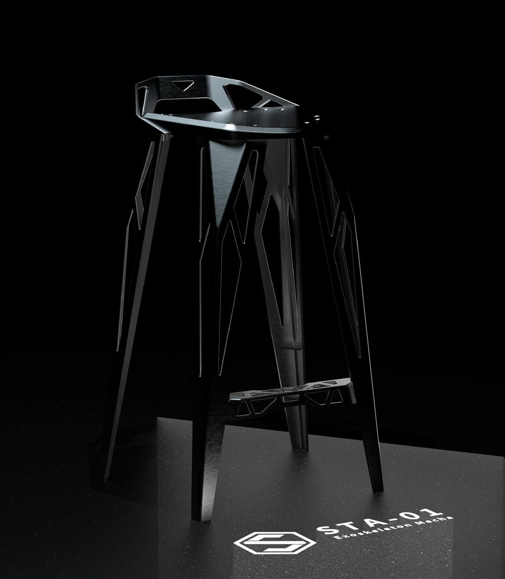 STA - 01是一張機甲造型 的吧檯椅,透過鋁這項材質 的高可塑性以及鑄造的加工 技術,探討機器人仿生的金 屬美學,研究機甲骨骼的造 型發展,將其型態和結構以 金屬鏤空的設計風格去呈現 機甲的型態美。