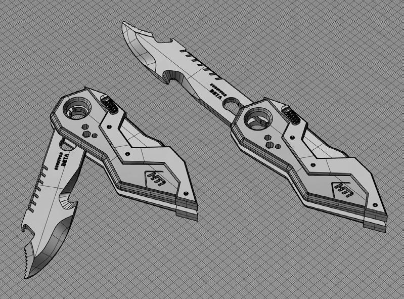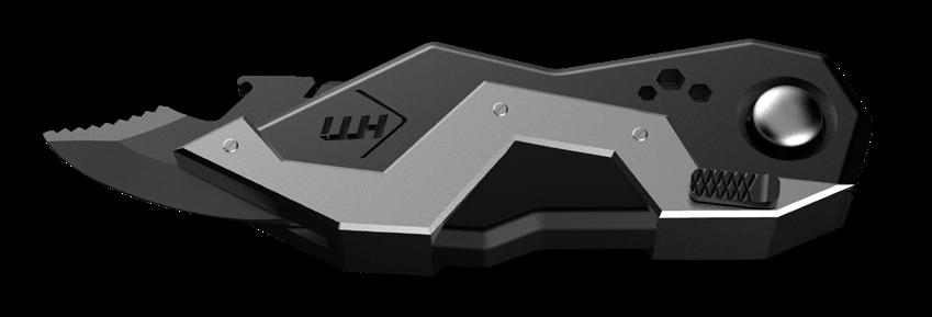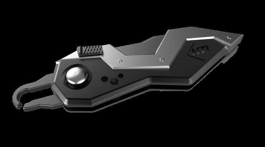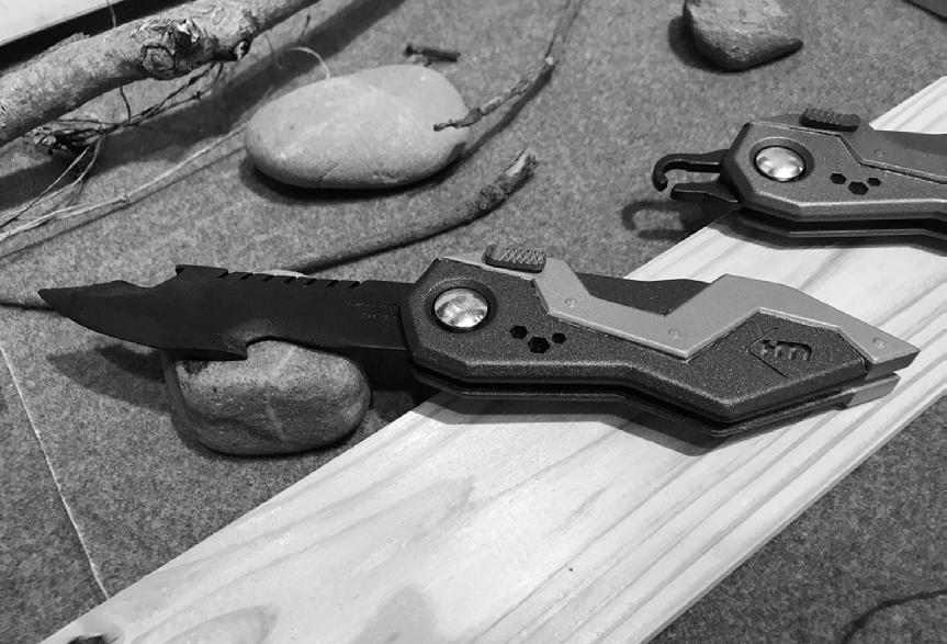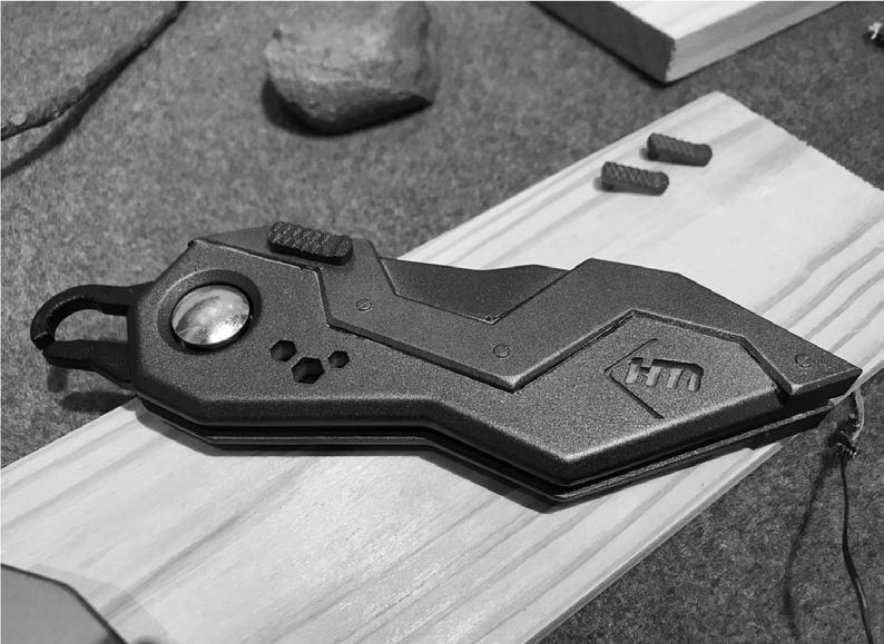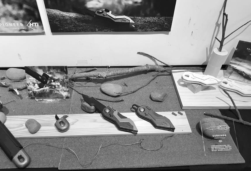 求,透過力矩的轉換,使刀子 的功能因而不同,它能處理 食物、木材。刀刃也融合鉤