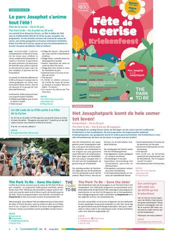 Schaarbeek opent de zomerperiode met evenementen die voor iedereen toegankelijk zijn. Het traditionele - en langverwachte! - Kriekenfeest (p. 4) strijkt op 24 en 25 juni opnieuw neer in het Josaphatpark, met een hele resem activiteiten voor jong en oud. Enkele dagen later gaat in het Josaphatpark ook een nieuwe editie van Brussels Urban Sessions door (p. 5), het grootste urban sportfestival van België, met onder meer een ronde van de UCI BMX Freestyle World Cup, die meetelt voor de kwalificatie voor de Olympische Spelen van 2024!