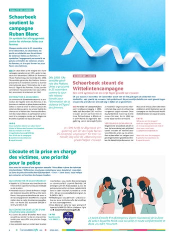 Le 25 novembre, c’est la Journée mondiale pour l’élimination des violences à l’égard des femmes. Les services communaux et la Zone de police Bruxelles Nord se mobilisent pour l’occasion. p. 3