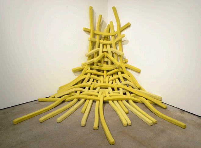 Landscaping practices point to our idealization of nature, curating land to be what we find attractive. I respond through material and construction to city landscaping and structure and my own impulse to plant a palm tree, exploring why we choose to seemingly improve the aesthetic appearance of our surroundings by often eradicating the “natural” in preference of the artificial. I weave as a response to this built environment. The grid provides essential architecture to both the city and woven cloth. Through observation of the gridded streets and buildings constructed of steel and concrete, I utilize the same materials to create responsive sculptures that present an opposing narrative to that of the solid and stable architecture. These works offer parallels between natural and synthetic, stable and decrepit, strength and fragility and embrace the temporal qualities of our fabricated environments.