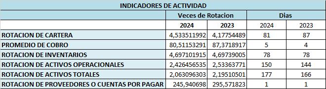 Se concluye que, en los respectivos análisis de los diferentes indicadores financieros, el indicador que sobresalió fue el indicador de actividad que a pesar de que tuvo un control adecuado sobre los inventarios y la gestión de cartera se obtuvo una disminución en el uso de los activos, donde se refleja un aumento en el tiempo de convertir los activos a ingresos por lo tanto tener estabilidad operativa es importante para poder tener oportunidades de mejora en la eficiencia de los activos.