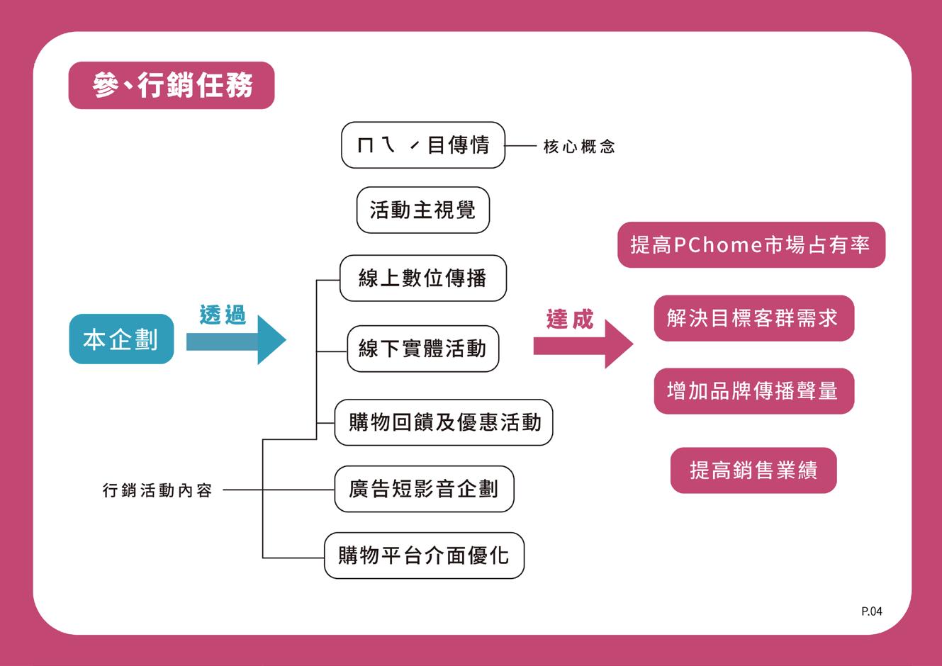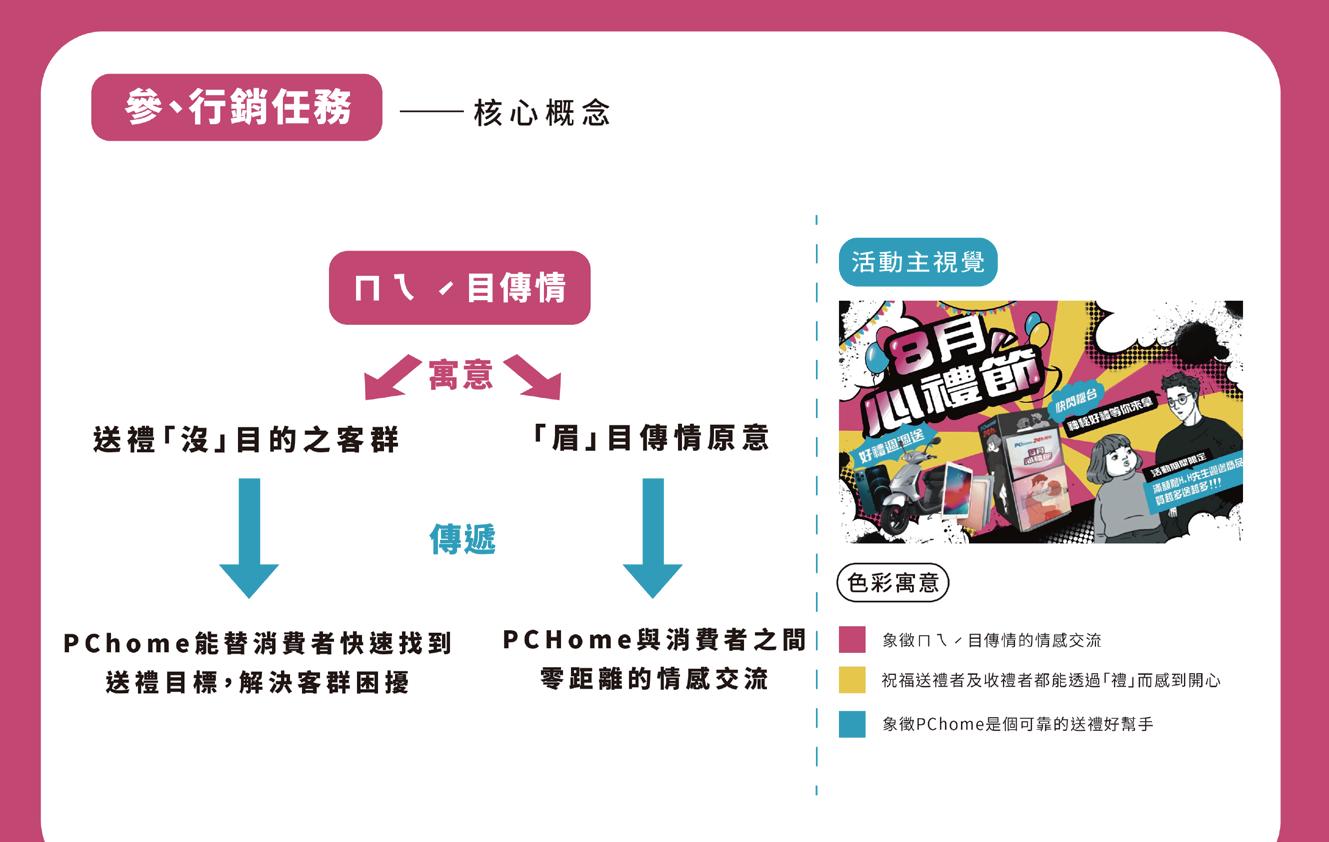 針對網路購物及想藉由送禮傳遞心地卻沒有主意之目標 客群,延伸出「ㄇㄟ ˊ 目傳情,PChome最懂禮」之副 標語,希望透過本企劃提升 PChome 在消費者心中的心 佔率,縮短送禮者與收禮者之間的感情距離,同時透過系 列活動開創良好商機。