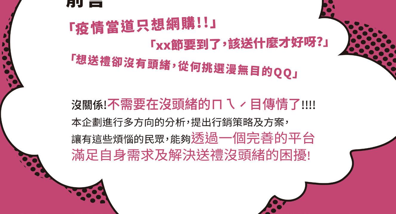 針對網路購物及想藉由送禮傳遞心地卻沒有主意之目標 客群,延伸出「ㄇㄟ ˊ 目傳情,PChome最懂禮」之副 標語,希望透過本企劃提升 PChome 在消費者心中的心 佔率,縮短送禮者與收禮者之間的感情距離,同時透過系 列活動開創良好商機。