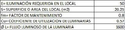 DE LUMINARIAS TECHO BLANCO =0.7 PAREDES CLARAS = 0.5 N ANCHO = 1.20 = A N LARGO = 2.28 = L LUXES REQUERIDO L/2 L/2 A/2 A/2 CÁLCULO DEL N° DE LUMINARIAS