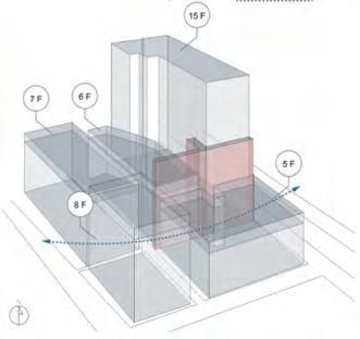 To admit sunlight further into the alley’s other open areas,adjustable reflective louvers attached to the underside glass flooring and reflective sur face panel on a wall will be used.