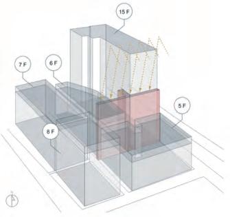 To admit sunlight into the interior private spaces, an adjustable one-way reflective louvers on sky light glass and reflective surface panels on walls will be used.