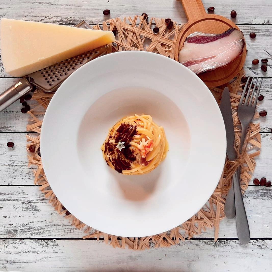 Servi la pasta alla carbonara e spolvera con caffè macinato.