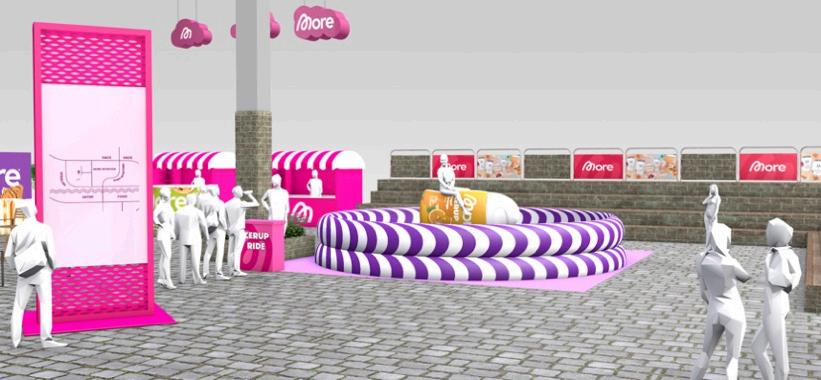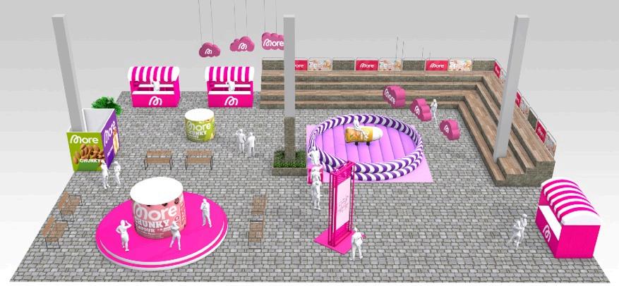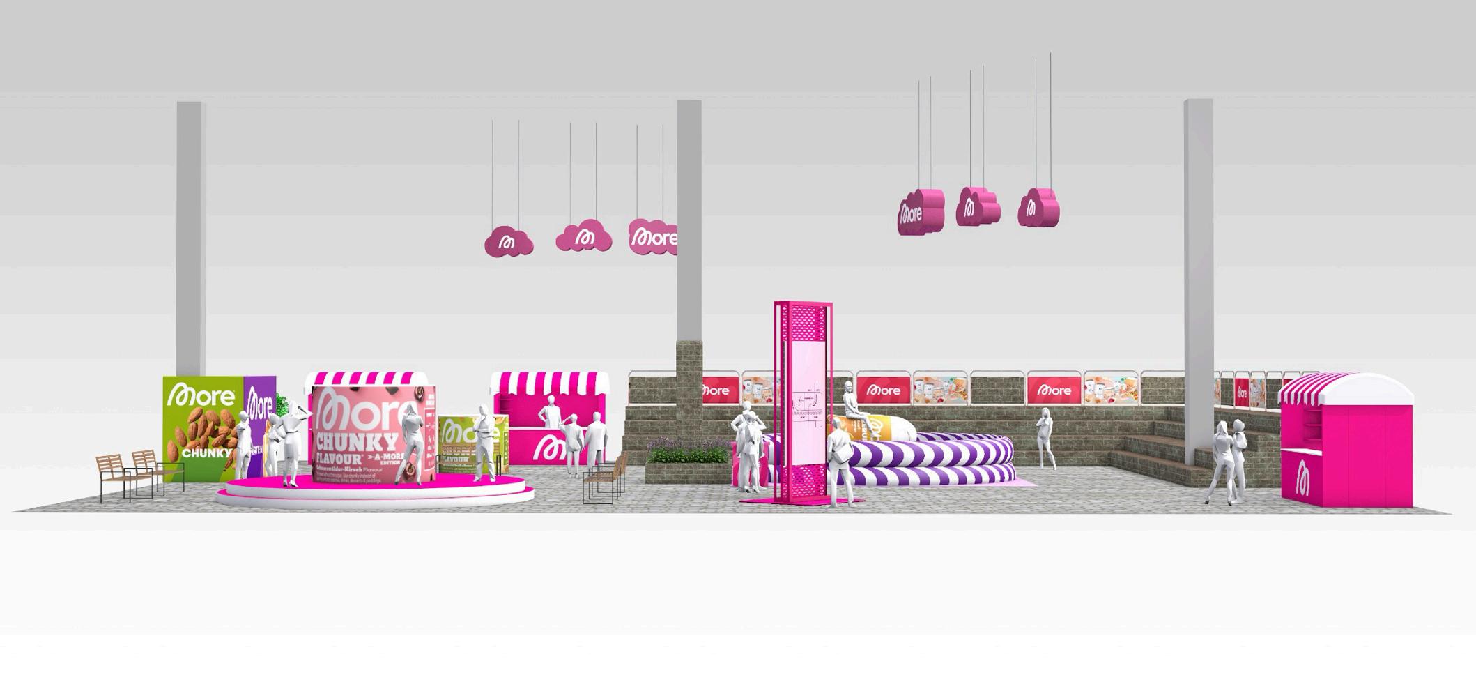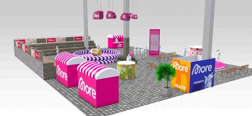 Stand development of More Nutrition in the event FIBO 2024, where different products of the brand are advertised and the space creates a fun experience for the visitors!