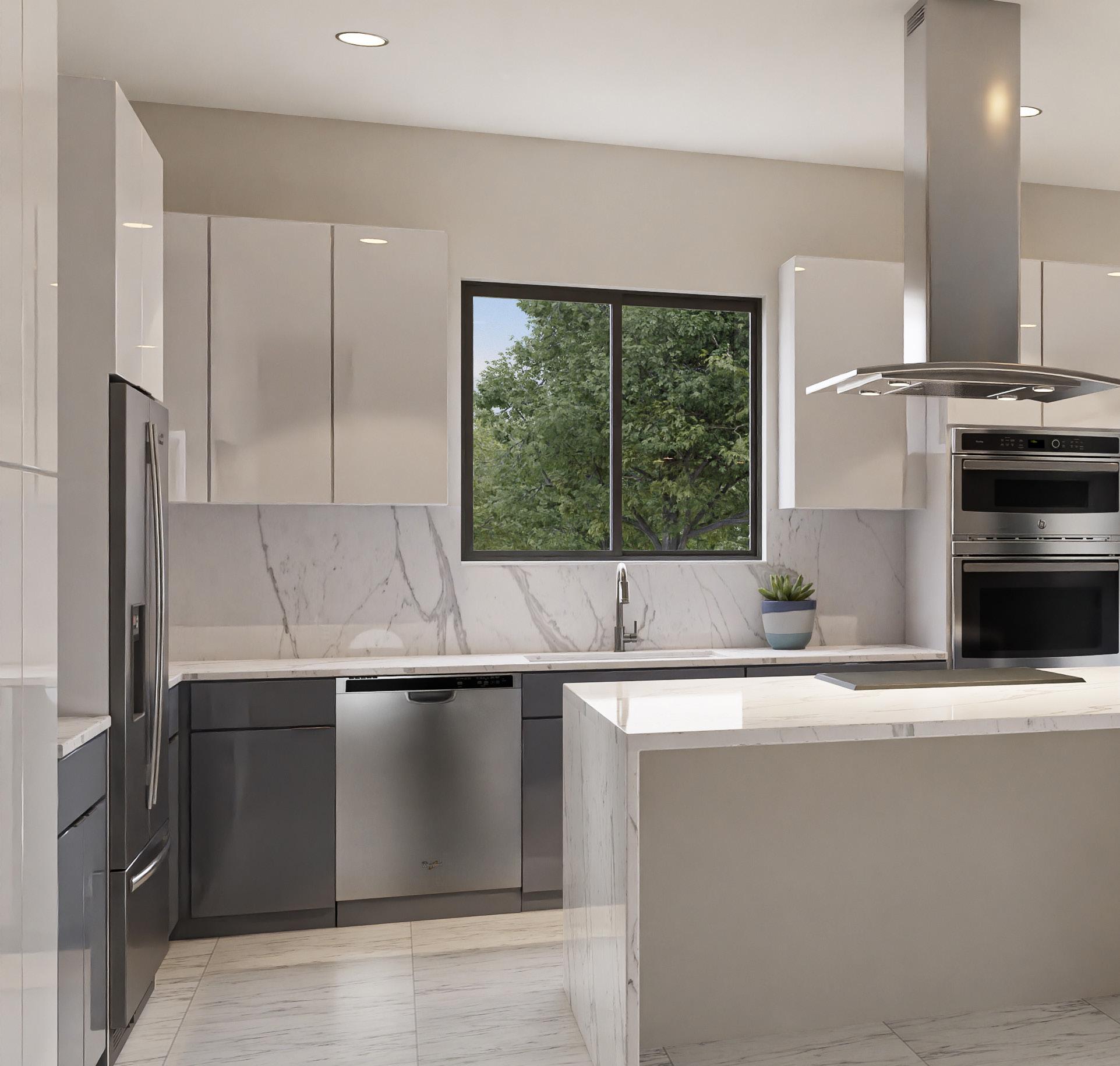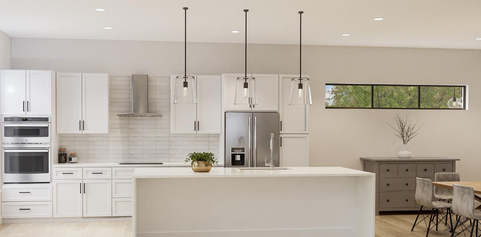 LUXURY INCLUDED PACKAGE 1 White Stacked Backsplash Tabarca Blanco 3” x9” Kitchen, Master & Secondary Bathrooms Bright White Shaker Cabinetry Quartz Countertops Silestone Miami Vena Matte Black Cabinet Pulls Matte Black Pendant Lighting