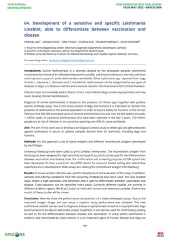 64. Development of a sensitive and specific Leishmania Lineblot, able to differentiate between vaccination and disease Andreas Latz1 , Daniela Heinz1 , Alba Fresco2 , Cristina Aira2 , Rouzbeh Mahdavi3 , Ulrich Steinhoff3 1) NovaTec Immundiagnostica GmbH, Veterinary Diagnostic Department, Dietzenbach, Germany 2) Eurofins Technologies Ingenasa; Lateral Flow Department, Madrid, Spain 3) Philipps-University Marburg; Institute for Medical Microbiology and Hospital Hygiene, Marbugr, Germany Corresponding author: Andreas.Latz@goldstandarddiagnostics.eu