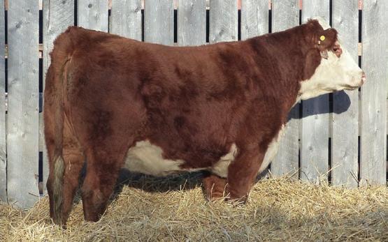 Legacy was purchased from River Valley Polled Herefords in Ontario. His sire is a nine time trait leader including birth weight and calving ease. Legacy has a tremendous disposition and as much thickness and fleshing ability as you'll ever see in a calving ease sire. His calves are born small from heifers but are lively and growthy. He is in the top 1% of the breed for calving ease and birth weight. BW: 65 lbs.