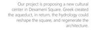 Dexamani Square is a complex and stunning urban public space at the center of Athens. The site is entrenched in deep geological, infrastructural, and cultural history. it includes the archeological ruins of a Hadrian-era aqueduct, two water reservoirs with rich architectural elements, an open air theater, cafes and other public spaces. The site functioned as a water nymphaeum of sorts, a neighborhood meeting place for local residents, and as a distribution basin for a larger and more extended community. The technical wonder that the Hadrian aqueduct is, both in terms of its capacity and sustainability throughout history and until the present times, as it still can operate as a canal for providing water for urban irrigation.