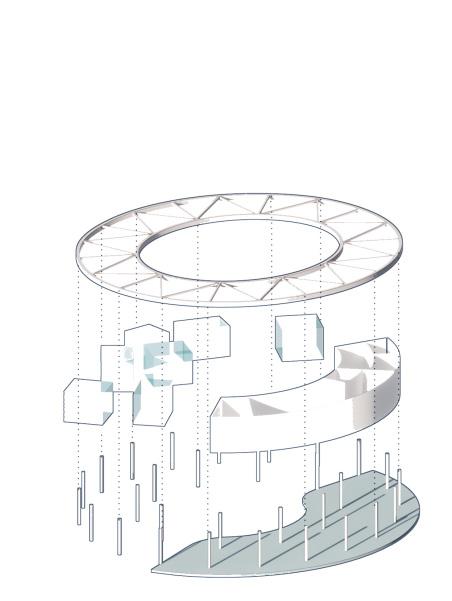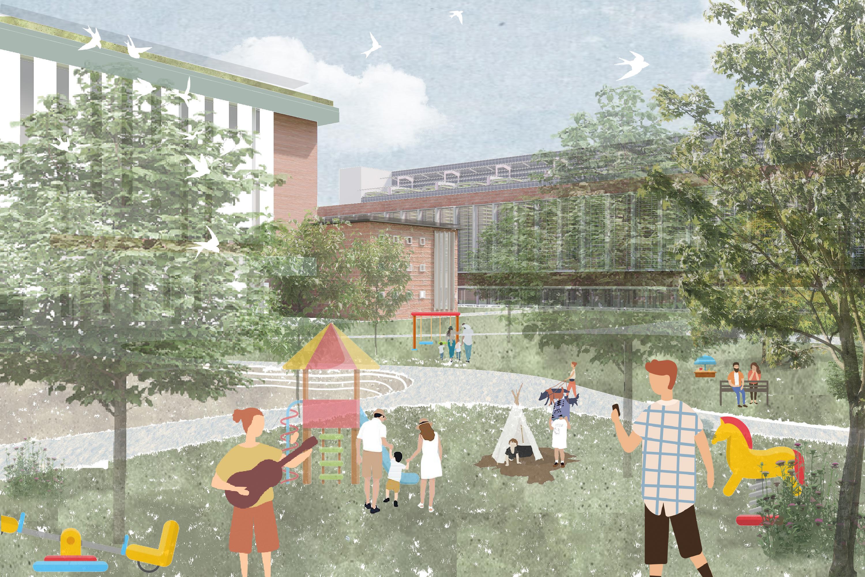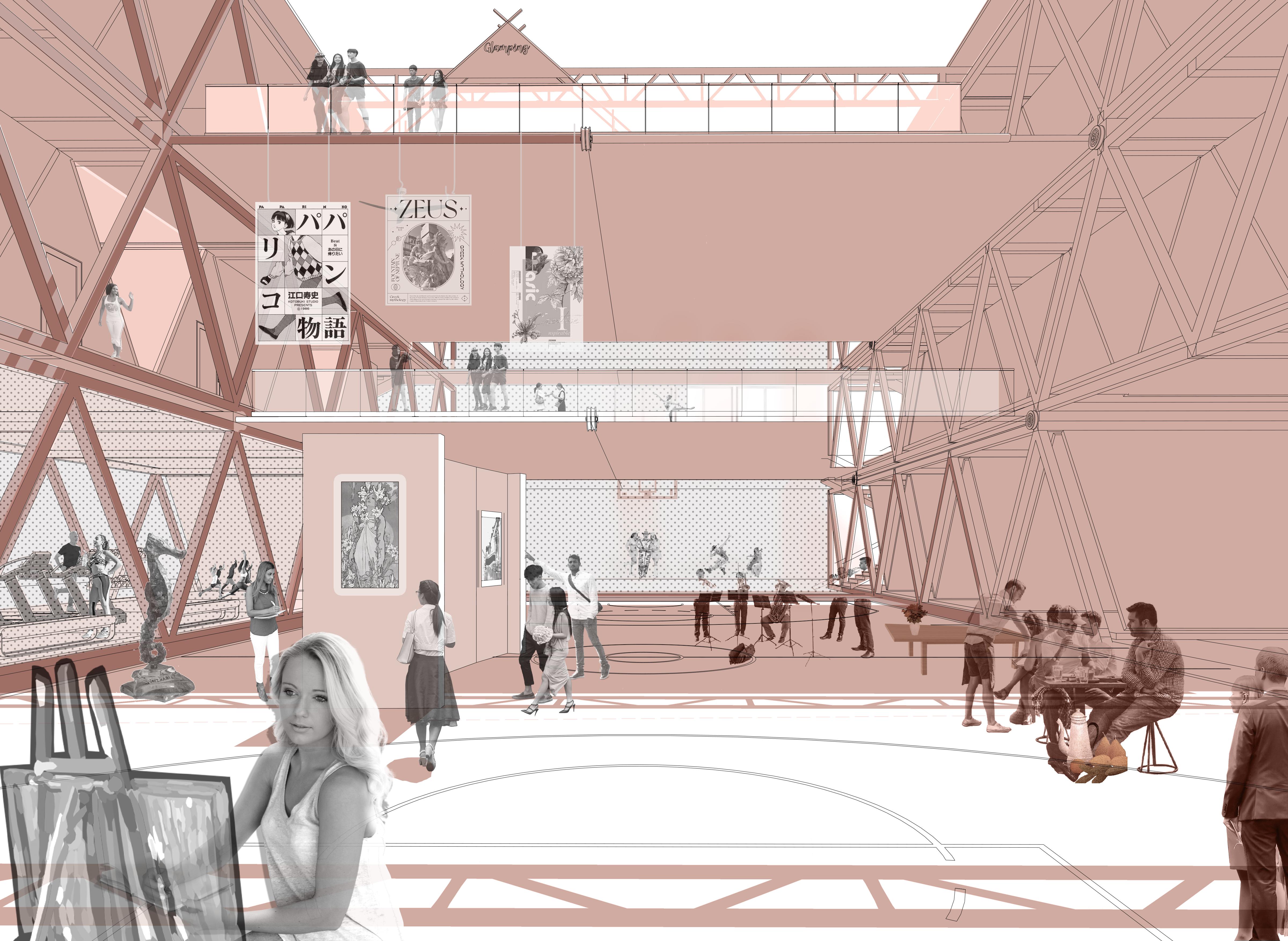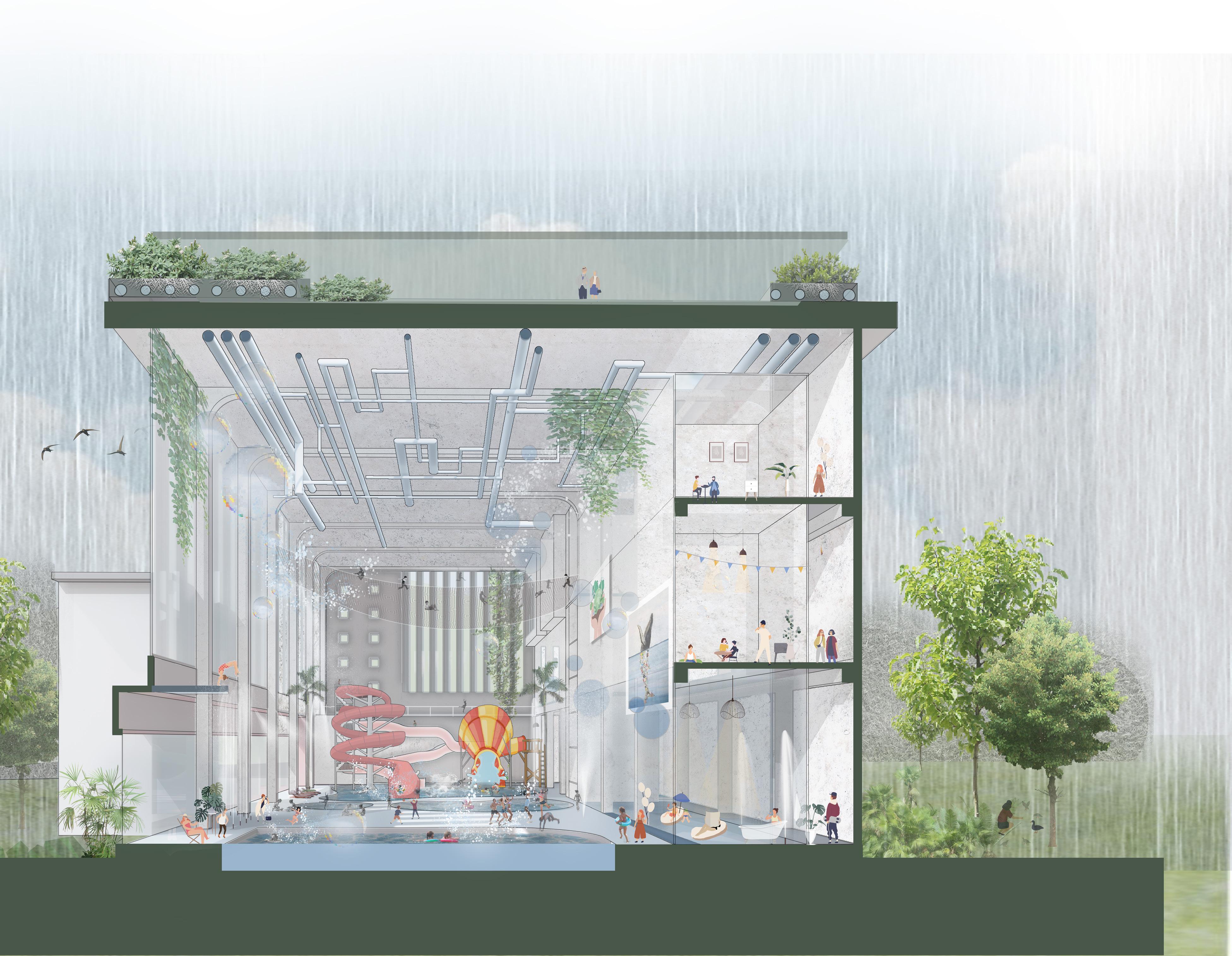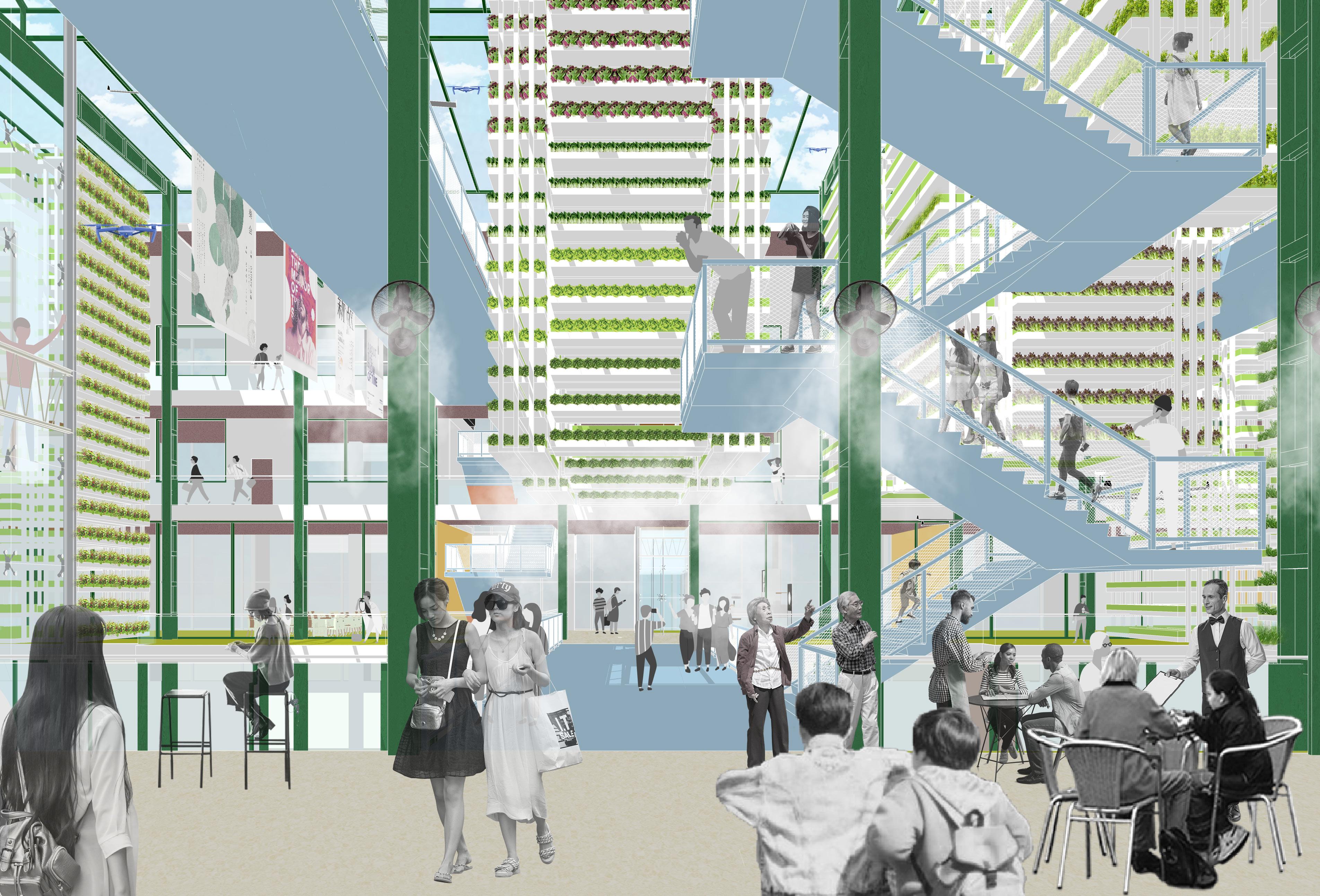 The power plant will be transformed into an urban agricultural complex, containing multi-functional flexible space of culture, sports, entertainment and art, which will provide dynamic space for the dense surrounding residents, office workers and tourists. The agricultural unit is suspended from the structure, and the main area of urban agriculture is taken as the upper air of the the top floor of the middle. Thus we could achieve self-sufficiency in agricultural products