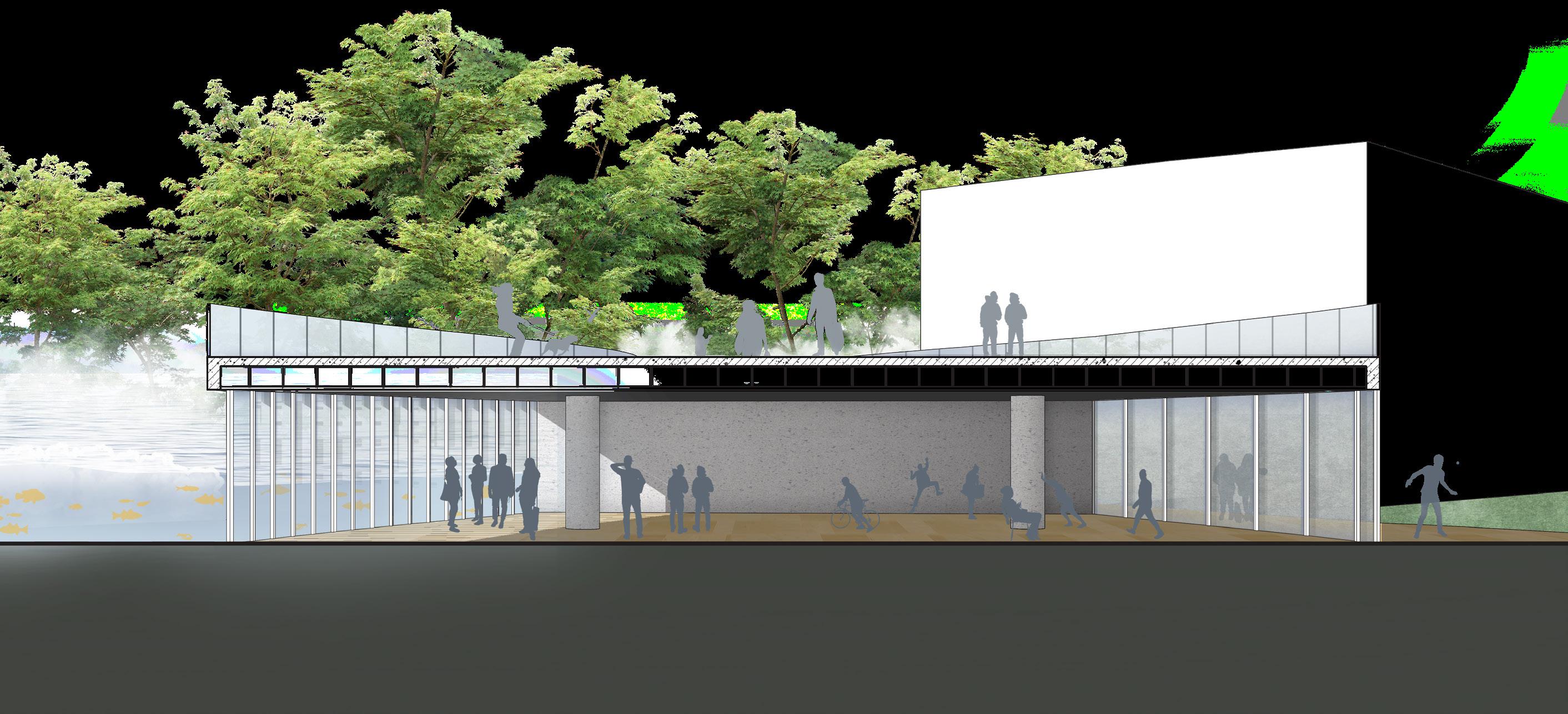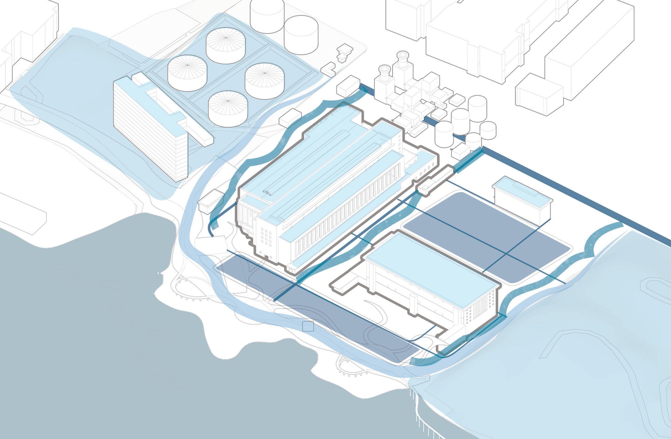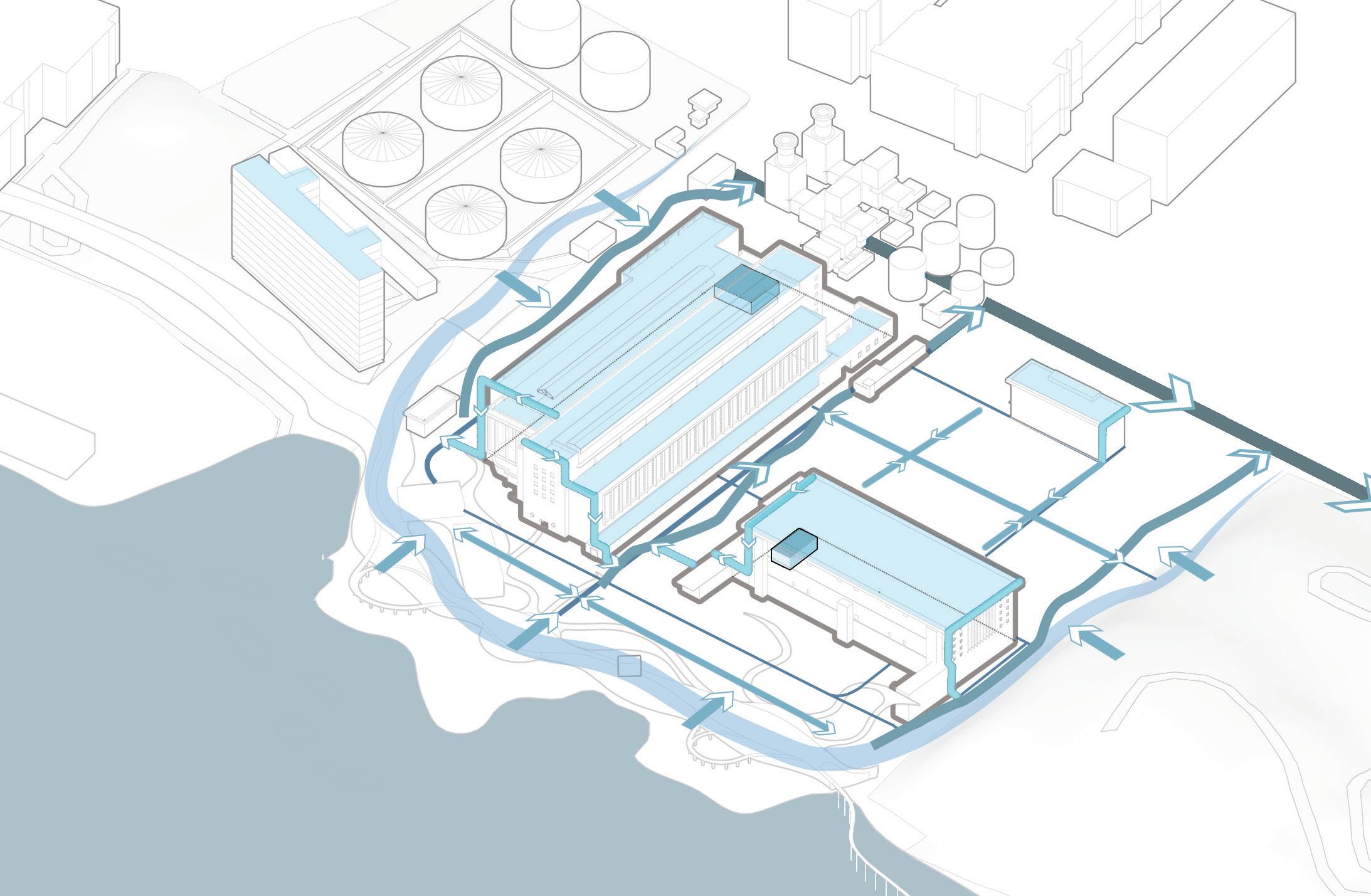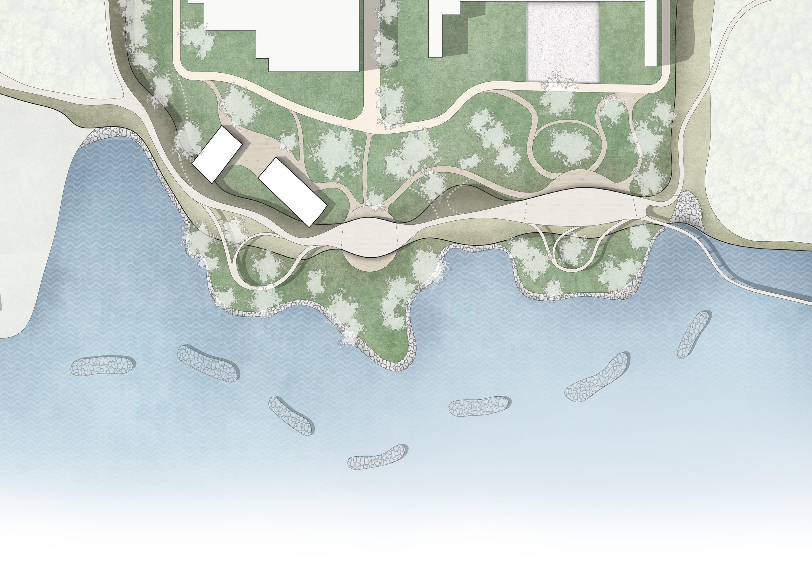 It is predicted that by the end of the century, the interior of the power plant will be flooded by rising sea water. Hence a new dam to connect the high hillsides on both sides of the power plant will be built to block the threat of rising sea level. On one side of the dam, a coastal park is designed mainly for human activities, and the original buildings are retained, and the functions are modified and reused. The outside of the dam will be restored as a waterfront ecological reserve based on the natural environment of decades ago.