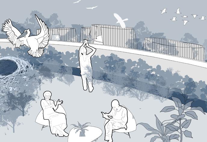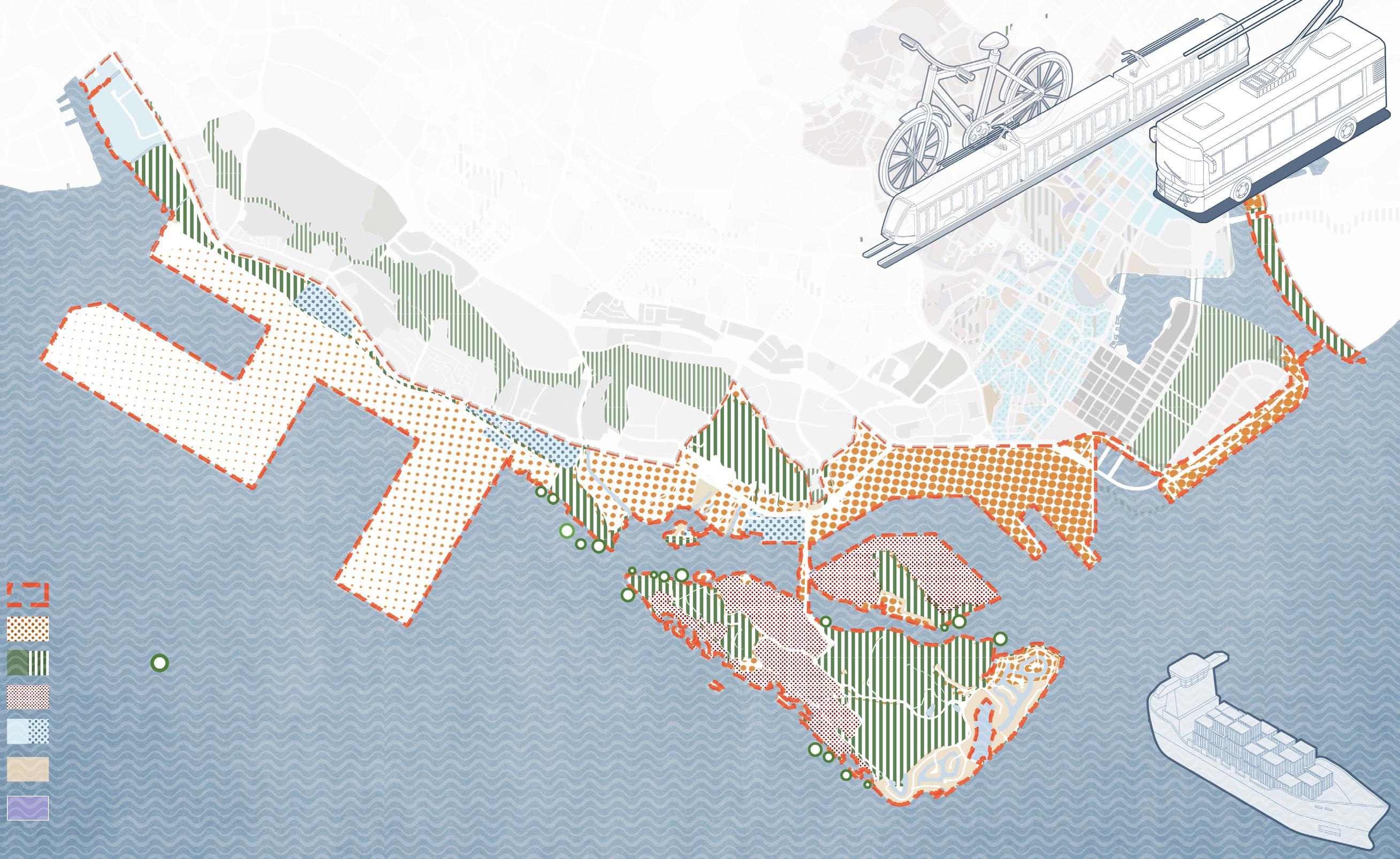 In terms of the urban scale, we found that the site's history of man-made development has led to the fracture of the overall veranda in the southern waterfront area. We hope to restore the ecology and social vitality of the site and repair the coastal green and blue corridor. We devide this into several section, in which we apply different methods which could be combined to function as a high-efficient system and community: reconstructing oil tanks into ecological tank, reconstructing power plants into different theme according to their own features, repairing coastal line in face of rising sea level etc. We hope these changes could restore a green, sustainable and vibrant society.