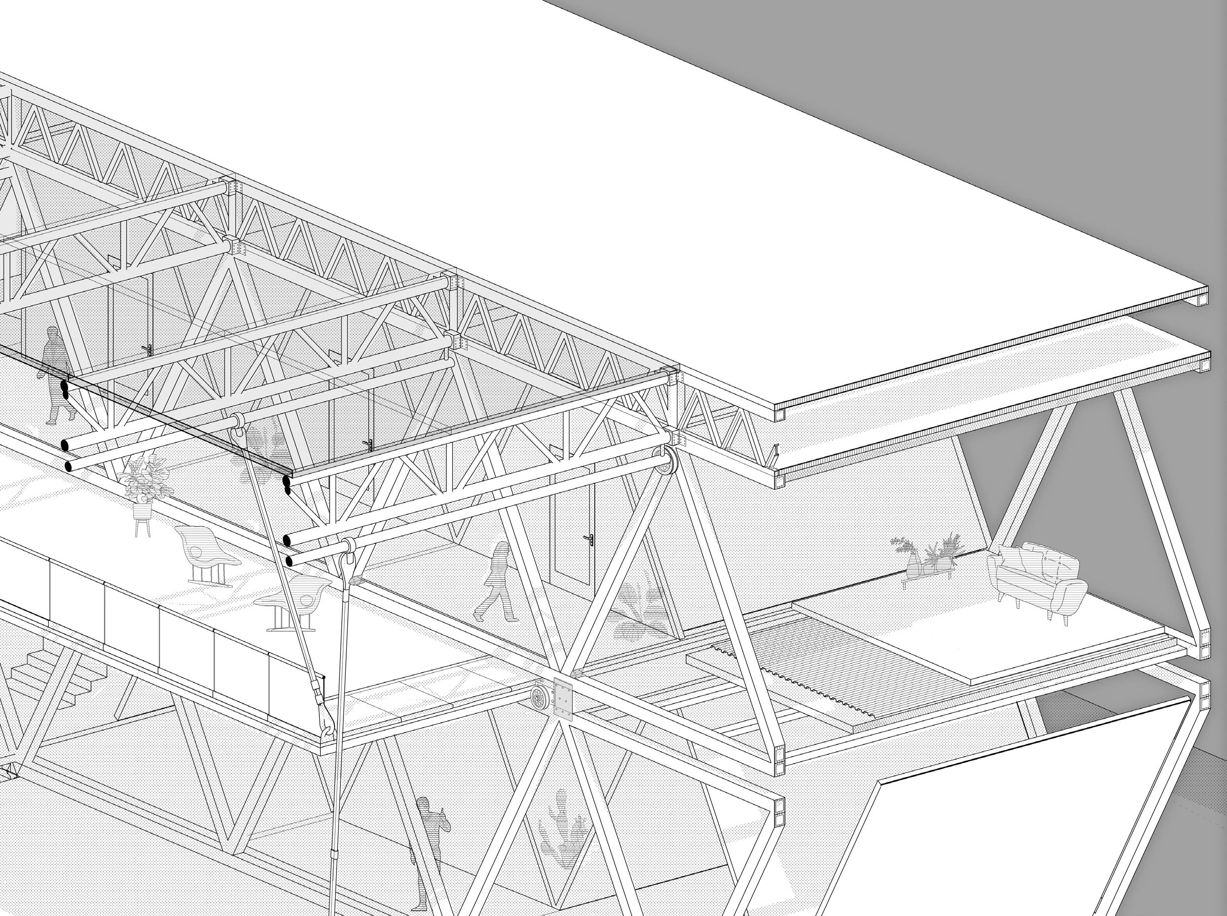 People's growing demand for public space is in conflict with land resources especially in cities. In order to build resistant architecture. Features of storage furniture is applied in the fantastic ideas This proposal is focused on function and utility over form, The triangle structure is not just for appearance but for space utility and stability. A reasonable design for nodes is introduced to realize the moving space in reality. The design makes it possible for us to imagine a uncommon landing construction and be close to a sustainable world.
