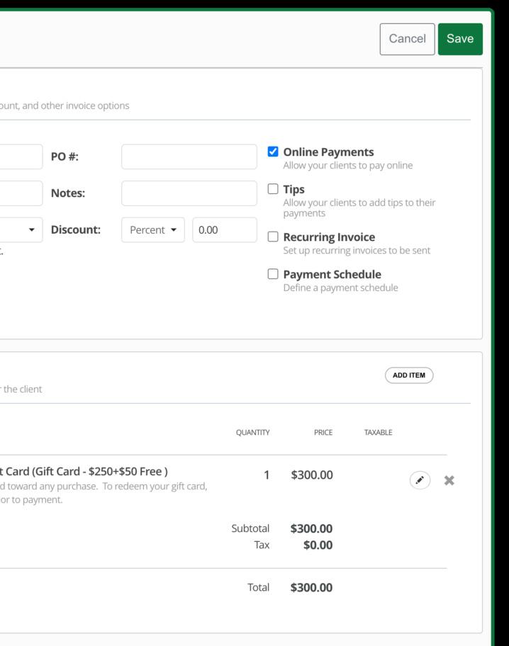 When a client redeems their card, simply open their invoice, click Record Payment, select Gift Card as the payment method, and enter the amount. The transaction won’t duplicate income but will still calculate sales tax correctly.