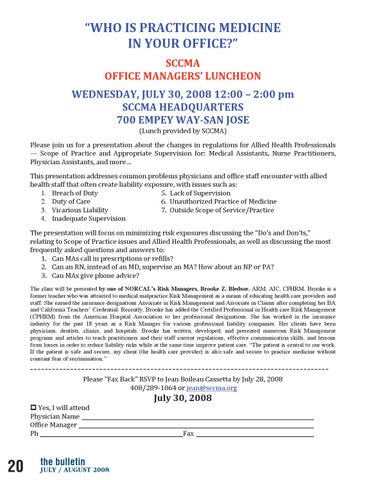 WEDNESDAY, JULY 30, 2008 12:00 – 2:00 pm SCCMA HEADQUARTERS 700 EMPEY WAYSAN JOSE (Lunch provided by SCCMA) Please join us for a presentation about the changes in regulations for Allied Health Professionals — Scope of Practice and Appropriate Supervision for: Medical Assistants, Nurse Practitioners, Physician Assistants, and more…