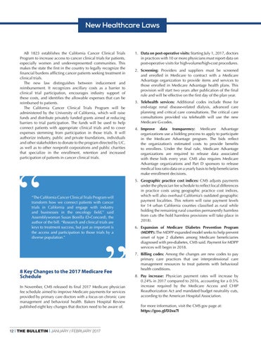 1. Data on post-operative visits: Starting July 1, 2017, doctors in practices with 10 or more physicians must report data on post-operative visits for high-volume/high-cost procedures. 2. Screening: Providers and suppliers must be screened and enrolled in Medicare to contract with a Medicare Advantage organization to provide items and services to those enrolled in Medicare Advantage health plans. This provision will start two years after publication of the final rule and will be effective on the first day of the plan year. 3. Telehealth services: Additional codes include those for end-stage renal disease-related dialysis, advanced care planning and critical care consultations. The critical care consultations provided via telehealth will use the new Medicare G-codes. 4. Improve data transparency: Medicare Advantage organizations use a bidding process to apply to participate in the Medicare Advantage program. The bids reflect the organization’s estimated costs to provide benefits to enrollees. Under the final rule, Medicare Advantage organizations are required to release data associated with these bids every year. CMS also requires Medicare Advantage organizations and Part D sponsors to release medical loss ratio data on a yearly basis to help beneficiaries make enrollment decisions. 5. Geographic practice cost indices: CMS adjusts payments under the physician fee schedule to reflect local differences in practice costs using geographic practice cost indices, which will also overhaul California’s outdated geographic payment localities. This reform will raise payment levels for 14 urban California counties classified as rural while holding the remaining rural counties permanently harmless from cuts (the hold harmless provisions will take place in 2018). 6. Expansion of Medicare Diabetes Prevention Program (MDPP): The MDPP expanded model seeks to help prevent onset of type 2 diabetes among Medicare beneficiaries diagnosed with pre-diabetes, CMS said. Payment for MDPP services will begin in 2018. 7. Billing codes: Among the changes are new codes to pay primary care practices that use interprofessional care management resources to treat patients with behavioral health conditions. 8. Pay increase: Physician payment rates will increase by 0.24% in 2017 compared to 2016, accounting for a 0.5% increase required by the Medicare Access and CHIP Reauthorization Act and mandated budget neutrality cuts, according to the American Hospital Association. For more information, visit the CMS.gov page at: https://goo.gl/D2xu7l