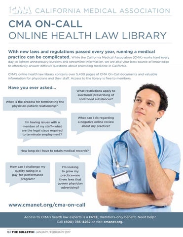 CMA ON-CALL ONLINE HEALTH LAW LIBRARY With new laws and regulations passed every year, running a medical practice can be complicated. While the California Medical Association (CMA) works hard every
