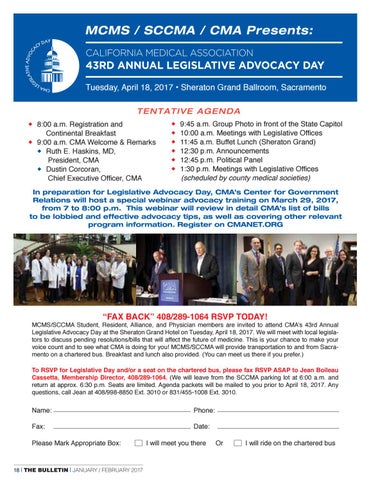 MCMS/SCCMA Student, Resident, Alliance, and Physician members are invited to attend CMA’s 43rd Annual Legislative Advocacy Day at the Sheraton Grand Hotel on Tuesday, April 18, 2017. We will meet with local legislators to discuss pending resolutions/bills that will affect the future of medicine. This is your chance to make your voice count and to see what CMA is doing for you! MCMS/SCCMA will provide transportation to and from Sacramento on a chartered bus. Breakfast and lunch also provided. (You can meet us there if you prefer.) To RSVP for Legislative Day and/or a seat on the chartered bus, please fax RSVP ASAP to Jean Boileau Cassetta, Membership Director, 408/289-1064. (We will leave from the SCCMA parking lot at 6:00 a.m. and return at approx. 6:30 p.m. Seats are limited. Agenda packets will be mailed to you prior to April 18, 2017. Any questions, call Jean at 408/998-8850 Ext. 3010 or 831/455-1008 Ext. 3010.