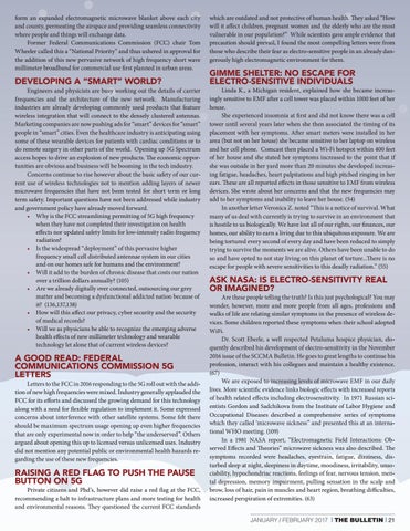 Are these people telling the truth? Is this just psychological? You may wonder, however, more and more people from all ages, professions and walks of life are relating similar symptoms in the presence of wireless devices. Some children reported these symptoms when their school adopted WiFi. Dr. Scott Eberle, a well respected Petaluma hospice physician, eloquently described his development of electro-sensitivity in the November 2016 issue of the SCCMA Bulletin. He goes to great lengths to continue his profession, interact with his collegues and maintain a healthy existence. (67) We are exposed to increasing levels of microwave EMF in our daily lives. More scientific evidence links biologic effects with increased reports of health related effects including electrosensitivity. In 1971 Russian scientists Gordon and Sadchikova from the Institute of Labor Hygiene and Occupational Diseases described a comprehensive series of symptoms which they called ‘microwave sickness” and presented this at an international WHO meeting. (109) In a 1981 NASA report, “Electromagnetic Field Interactions: Observed Effects and Theories” microwave sickness was also described. The symptoms recorded were headaches, eyestrain, fatigue, dizziness, disturbed sleep at night, sleepiness in daytime, moodiness, irritability, unsociability, hypochondriac reactions, feelings of fear, nervous tension, mental depression, memory impairment, pulling sensation in the scalp and brow, loss of hair, pain in muscles and heart region, breathing difficulties, increased perspiration of extremities. (63) JANUARY / FEBRUARY 2017 | THE BULLETIN | 21