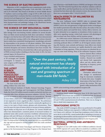 The most recent and compelling evidence has come from the 2016 National Institutes of Health, National Toxicology Program. Called the NTP Toxicology and Carcinogenicity Cell Phone Radiation Study, the 10 year $25 million research revealed conclusively that there was a harmful effect from cell phone microwave radiation. (124,125) The frequencies are similar to other wireless devices we commonly use. The studies were robust, collaborative, well controlled and with double the number of rats required to reveal a significant effect, if present. The preliminary results of the study showed that RFR caused a statistically significant increase in two types of brain tumors, gliomas and schwannomas. These were the same two types of tumors shown to increase in human epidemiological studies on long term use of cell phones. Dr. Lennart Hardell and others have demonstrated a consistent pattern of increased incidence of ipsilateral (same side) acoustic neuromas (vestibular schwannomas) and gliomas with each 100 hours of cell phone use. (112-118) Another telling finding was that the control rats had much lower than expected cancer rates. It is believed due to the fact the control rats were in a controlled faraday cage and not exposed to normal ambient EMF that could contribute to cancer. Ron Melnik, PhD, Senior Toxicologist and Director of Special Programs in the Environmental Toxicology Program at the National Insti22 | THE BULLETIN | JANUARY / FEBRUARY 2017