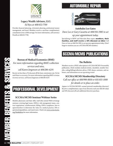 PROFESSIONAL DEVELOPMENT SCCMA/MCMS Seminar/Webinar Series Member physicians and their office staff often attend FREE-of-charge seminars covering legal issues, HIPAA, risk management issues, contract negotiations, reimbursement, billing, OSHA compliance, how to open/close/how to determine the value of a medical practice, HR requirements/guidelines, and much more. Check out www.sccma-mcms. org/TheBulletin for more information.